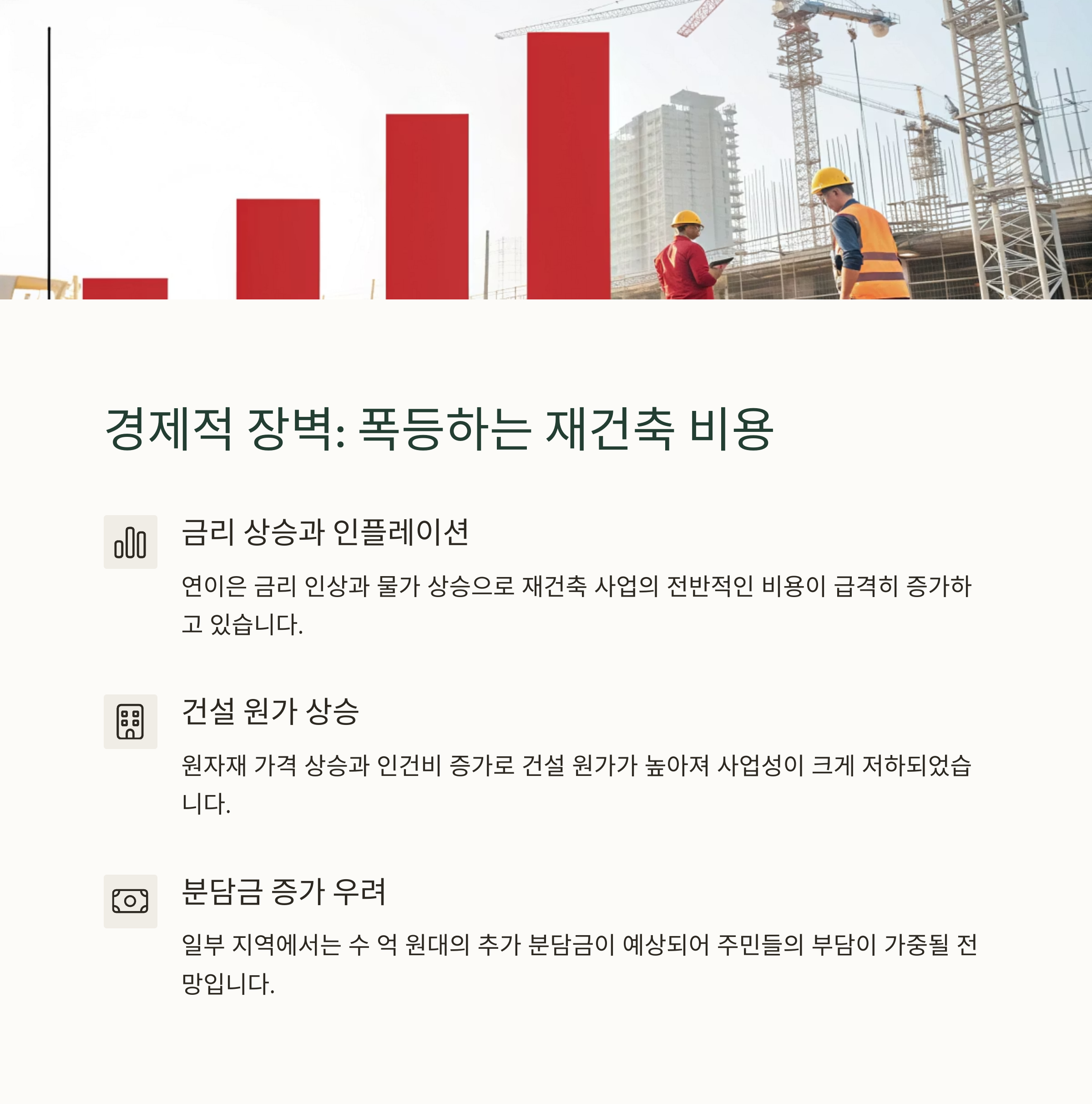 둘째, 금리와 물가 상승은 재건축 비용을 급등시키며, 이는 주민의 재정적 부담을 가중시키고 있습니다.