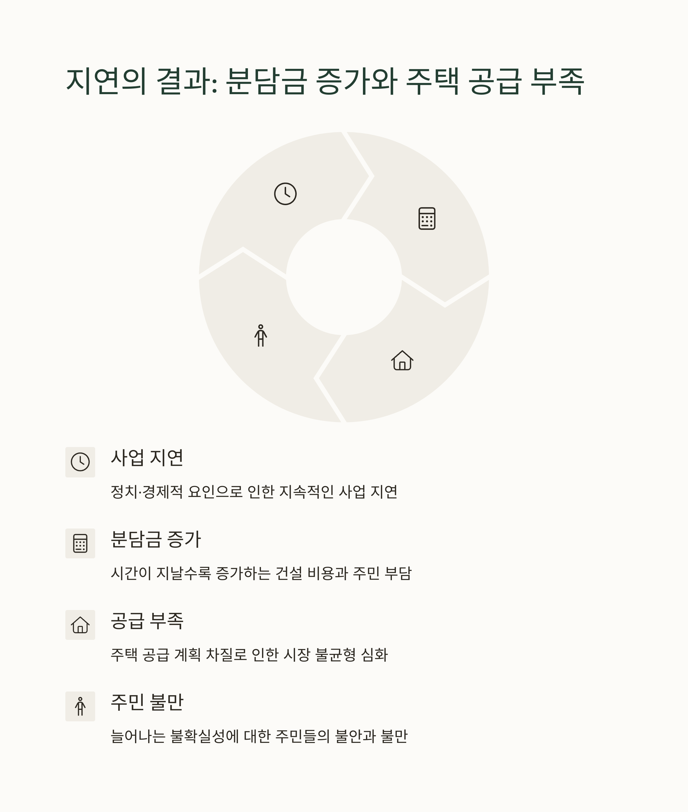 주민 갈등은 재건축 사업 지연의 주된 요인 중 하나입니다. 주민 간 의견 충돌은 사업 동의율 확보를 어렵게 만들고, 이는 사업 일정이 늦어지게 되는 주요 원인입니다. 특정 세대는 새로운 주거 환경을 선호하는 반면, 다른 세대는 재건축 비용 부담을 우려하며 다른 입장을 보이는 경우가 많습니다.