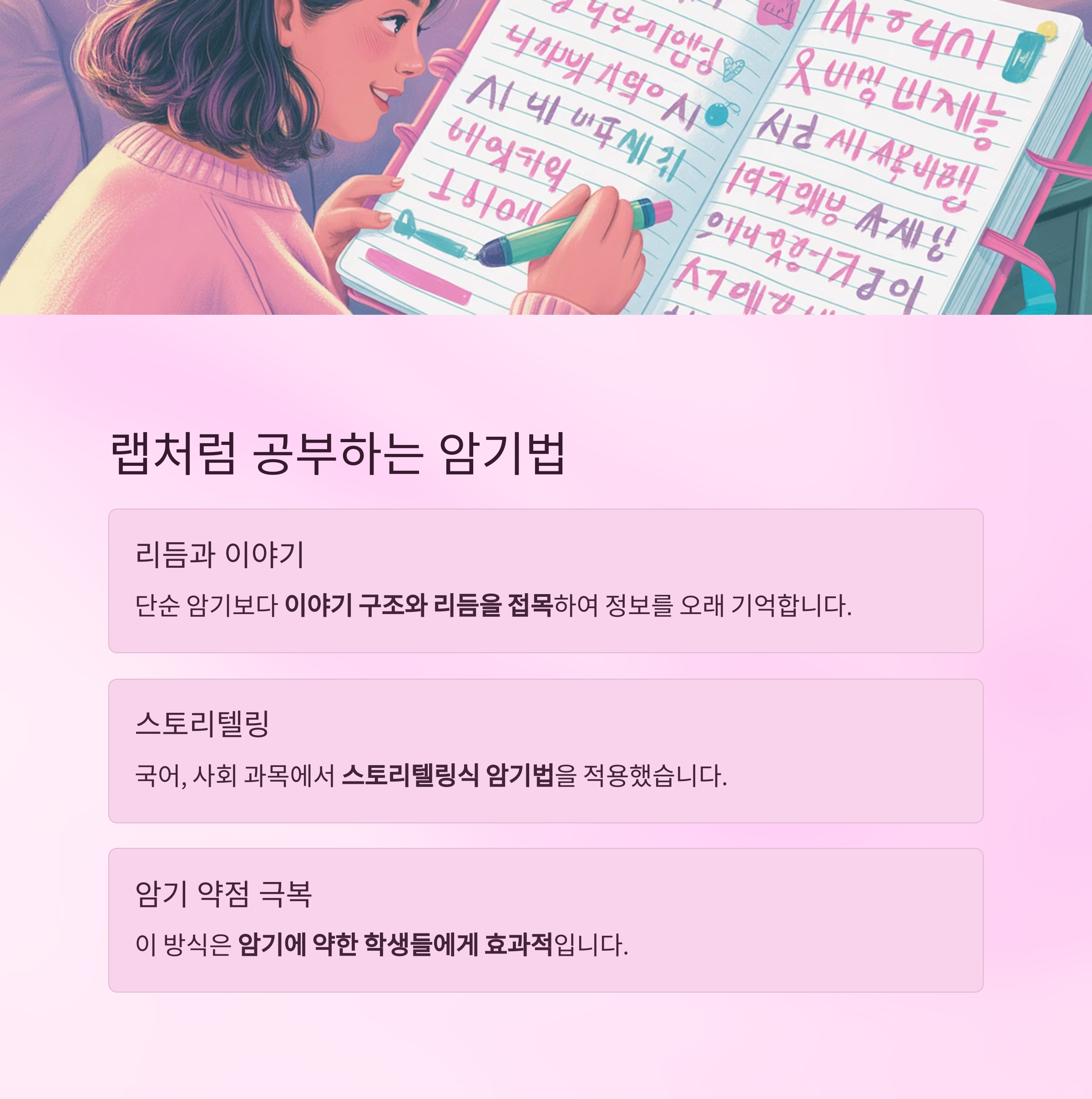 국어나 사회 과목에서 스토리텔링식 암기법을 적용하며,
