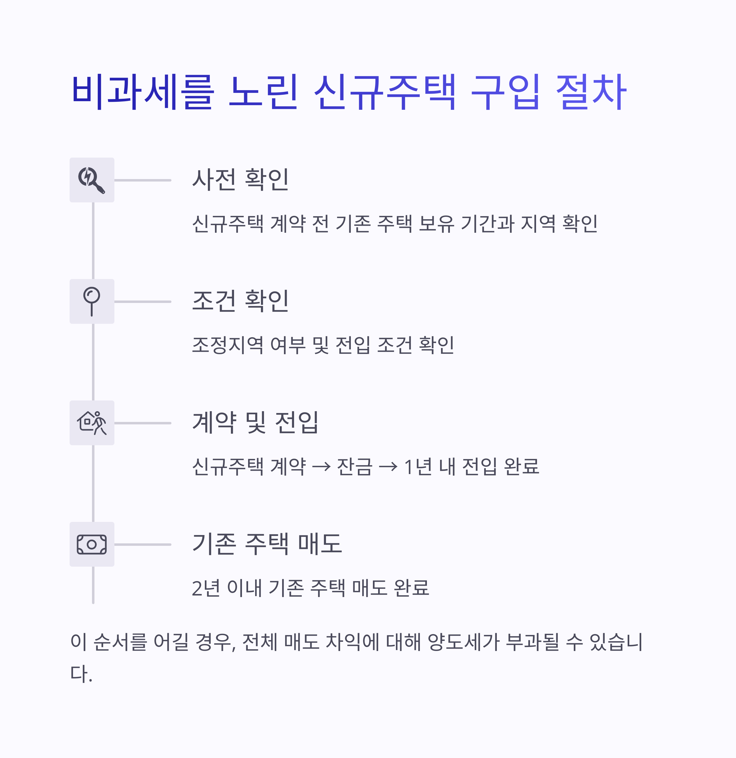 이 순서를 어길 경우, 전체 매도 차익에 대해 양도세가 부과될 수 있습니다.