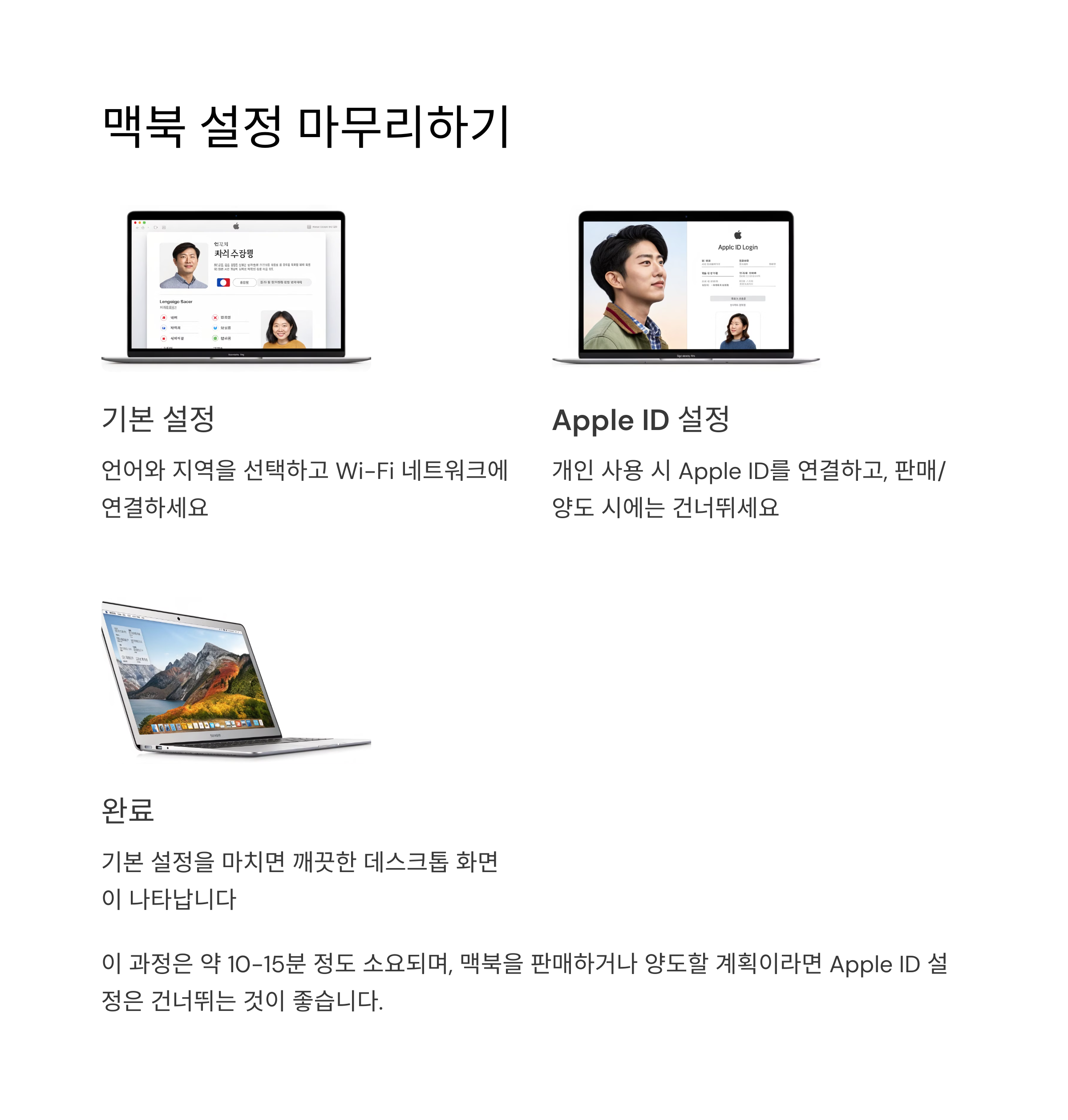 | 파일이 많을수록 더 많은 시간 소요 | 네트워크 연결 확인 후, 복구 모드 진입 시 Apple 로고를 기다림 | 재설치 완료 후 언어 및 네트워크 설정 진행 |
