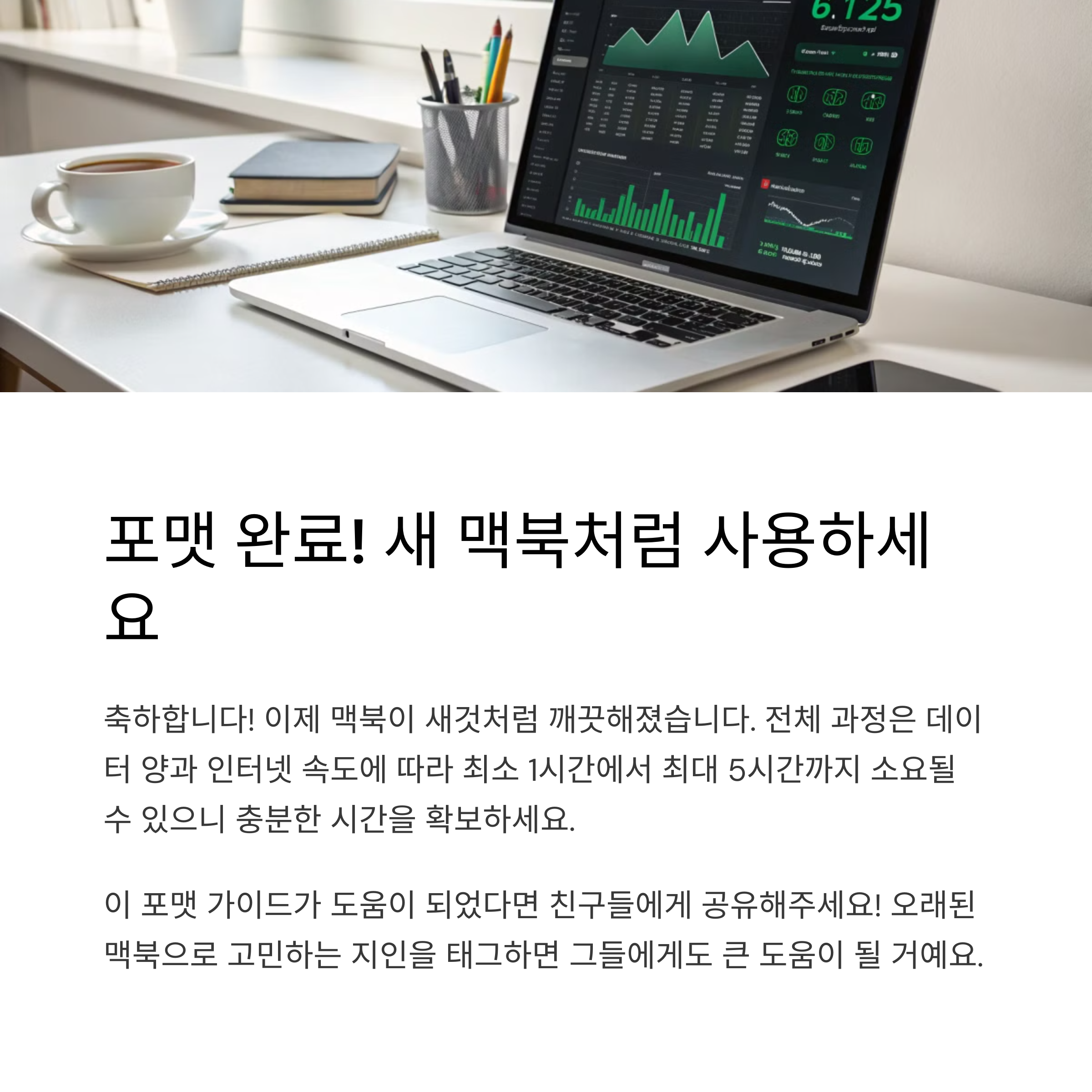 맥북 포맷은 간단하지만 중요한 단계입니다. 이 가이드를 따라 진행하시면 데이터 백업과 복구 모드 진입부터 macOS 재설치까지 순차적으로 진행할 수 있습니다. 포맷이 완료되면 맥북이 새롭게 설정되어 초기 상태로 돌아갑니다. 사용하시기 전에 꼭 중요한 데이터를 백업해 두시기 바랍니다.