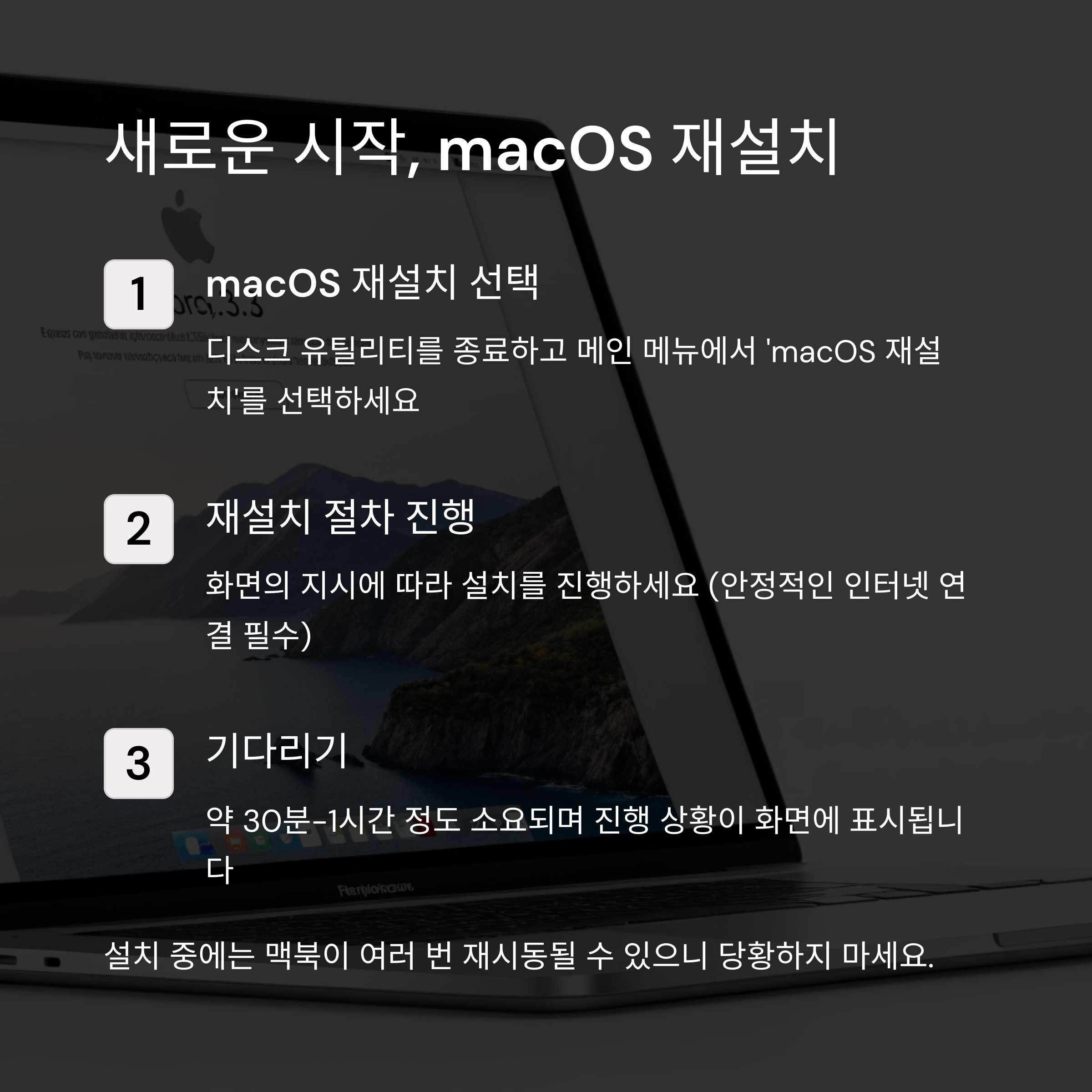 | Time Machine, 외장 하드 드라이브, iCloud로 백업 | Command + R 키를 눌러 복구 모드로 진입 | macOS 유틸리티에서 재설치를 시작하고 지시에 따라 진행 |