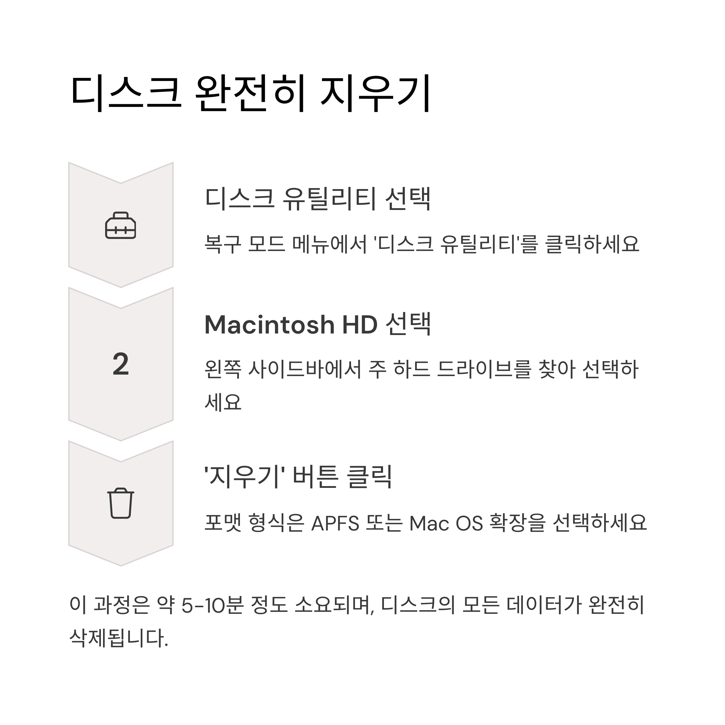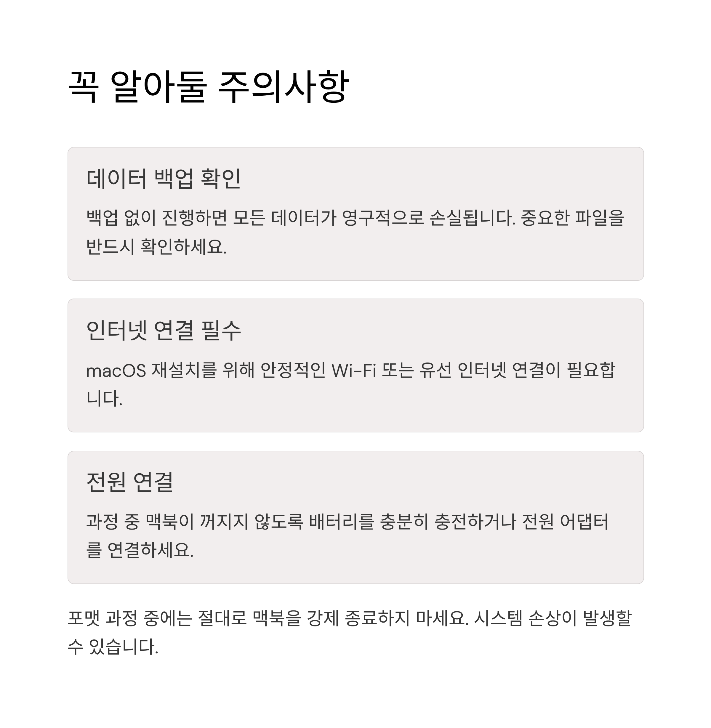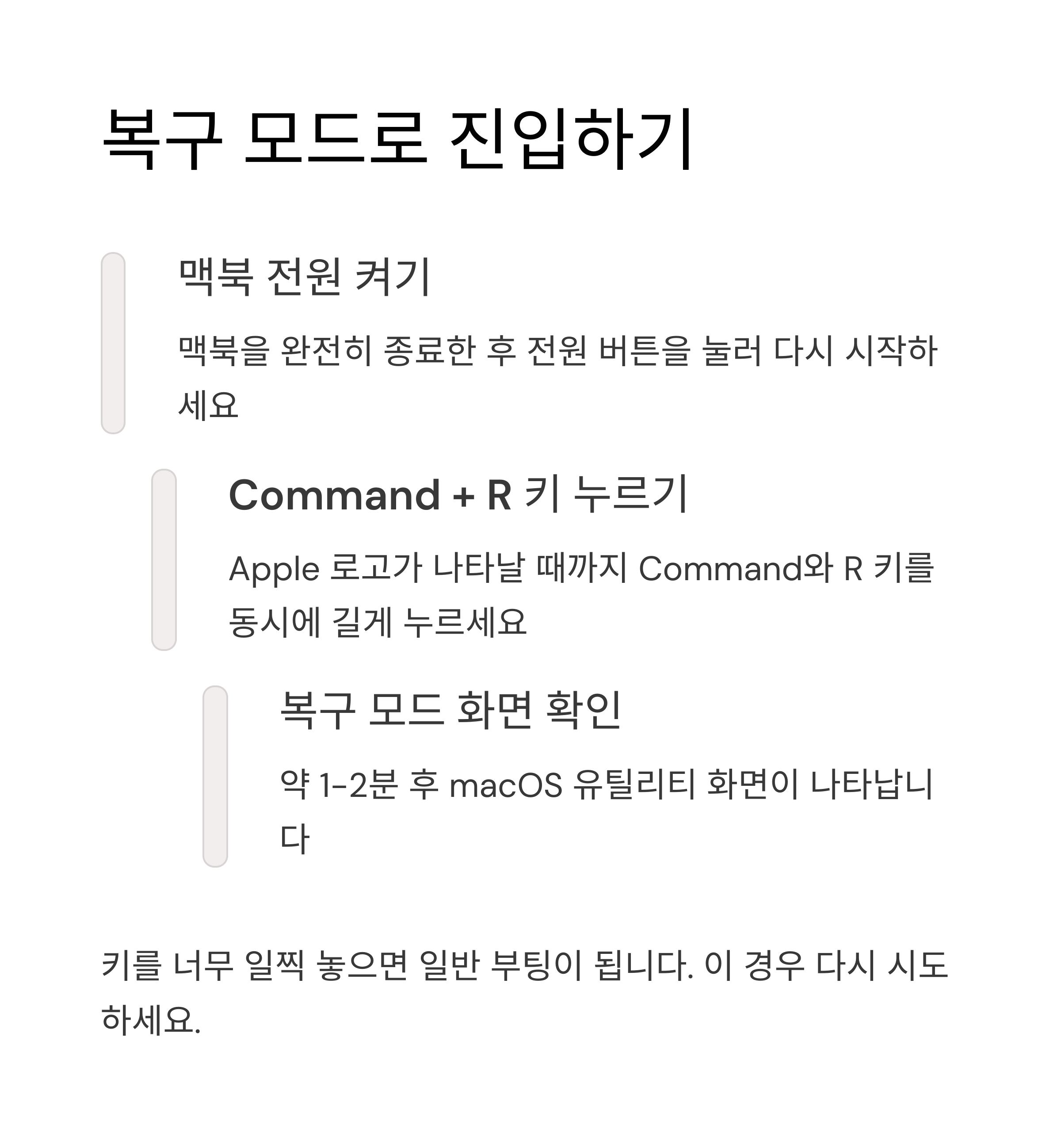| 복구 모드 진입 | Command + R 키로 복구 모드에 진입하여 포맷을 시작 |