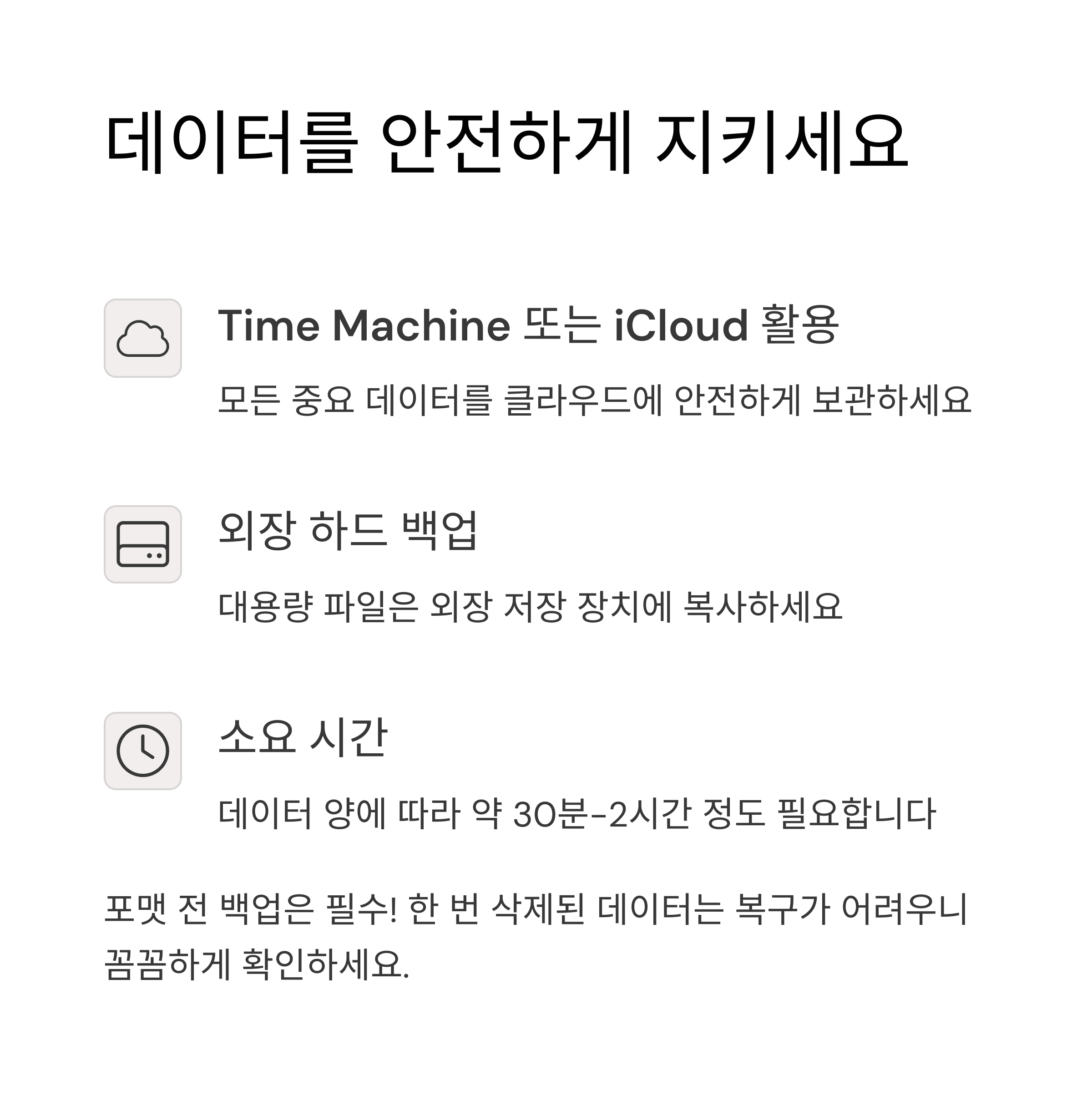 포맷을 시작하기 전에 데이터 백업은 매우 중요한 단계입니다. 중요한 파일은 외장 하드나 USB 드라이브, iCloud를 사용해 백업해야 합니다. 특히 Apple의 Time Machine 기능을 활용하면 자동으로 백업할 수 있어 매우 편리합니다. 백업이 완료되면, 맥북을 완전히 종료하고 복구 모드에 진입할 준비를 해야 합니다. 인터넷 연결이 안정적이고, 전원이 충분히 공급되고 있는지 다시 한 번 확인하세요.