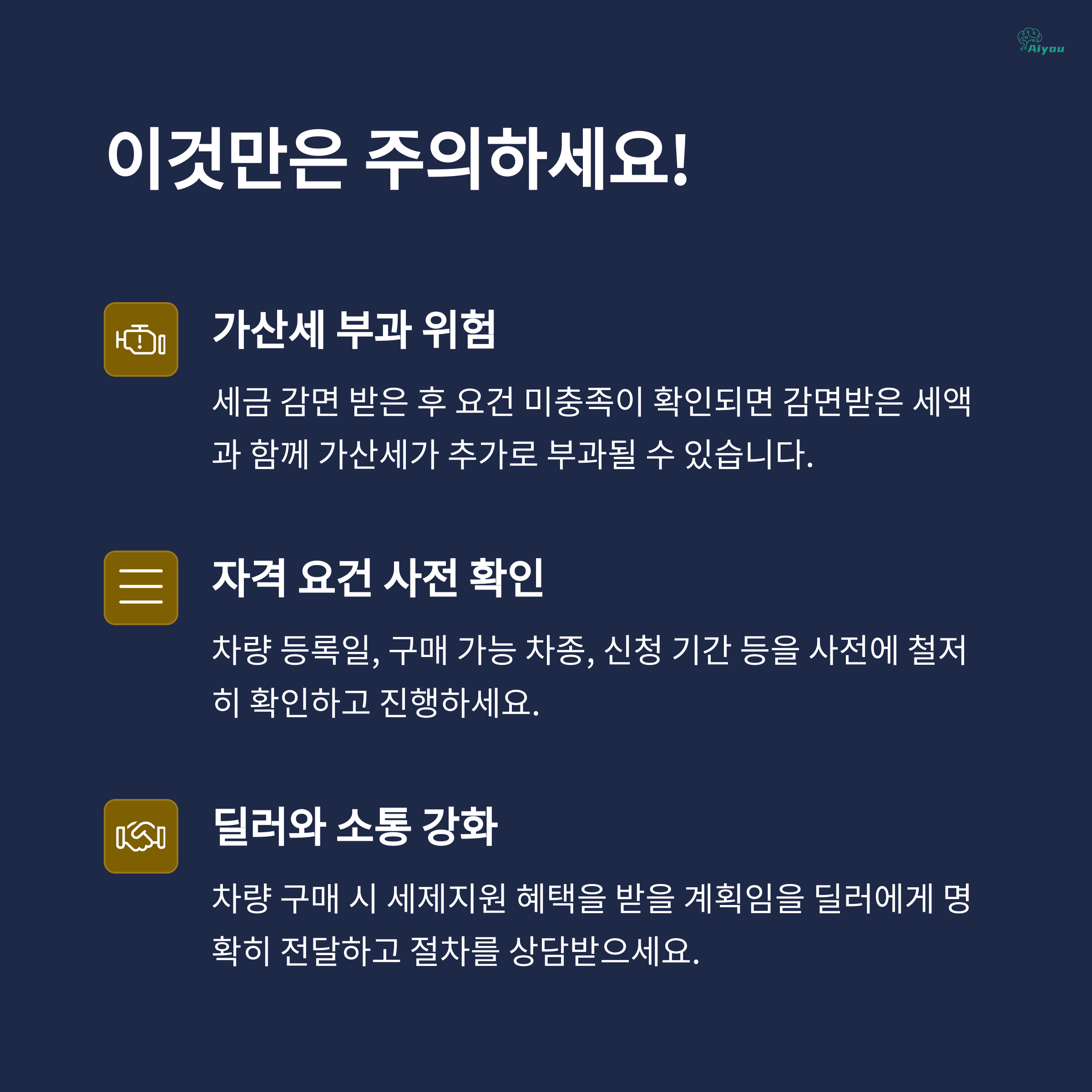 이처럼 ‘명의 일치’는 사소해 보이지만 실제로 감면 여부를 결정짓는 핵심 요소다. 차량 등록 시 반드시 본인의 명의가 포함되도록 주의해야 하며, 공동명의를 통해 유연하게 적용하는 것도 방법이다.