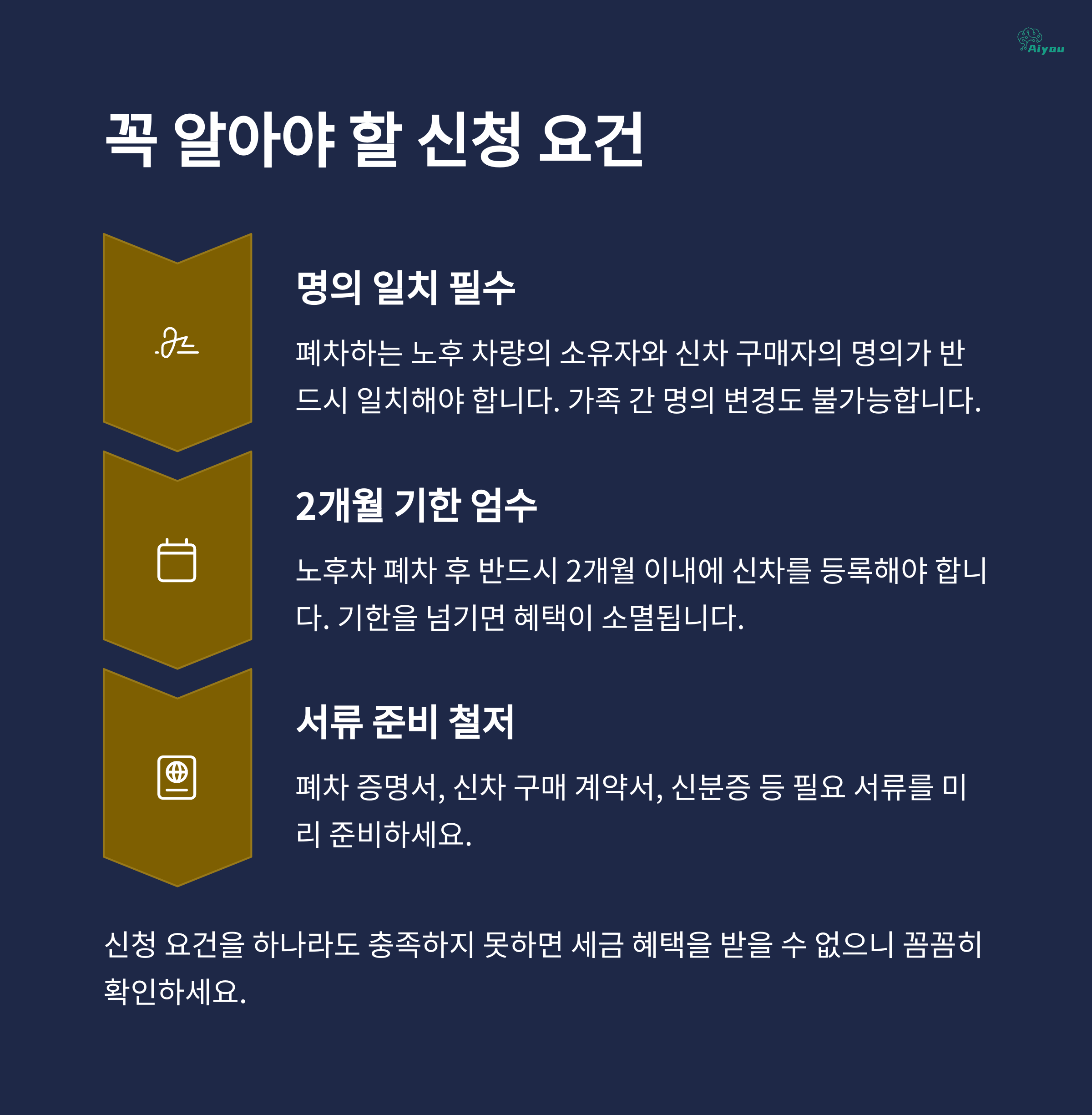 특히, 말소등록 시기와 신차 등록일 사이의 2개월이라는 시간 제약은 가장 자주 실수하는 항목이다. 여기에 신차와 노후차의 명의 일치 여부, 차종의 제한(승용차 또는 RV, 경유 제외), 개별소비세 부과 여부 등 다양한 조건을 한꺼번에 충족해야 한다.