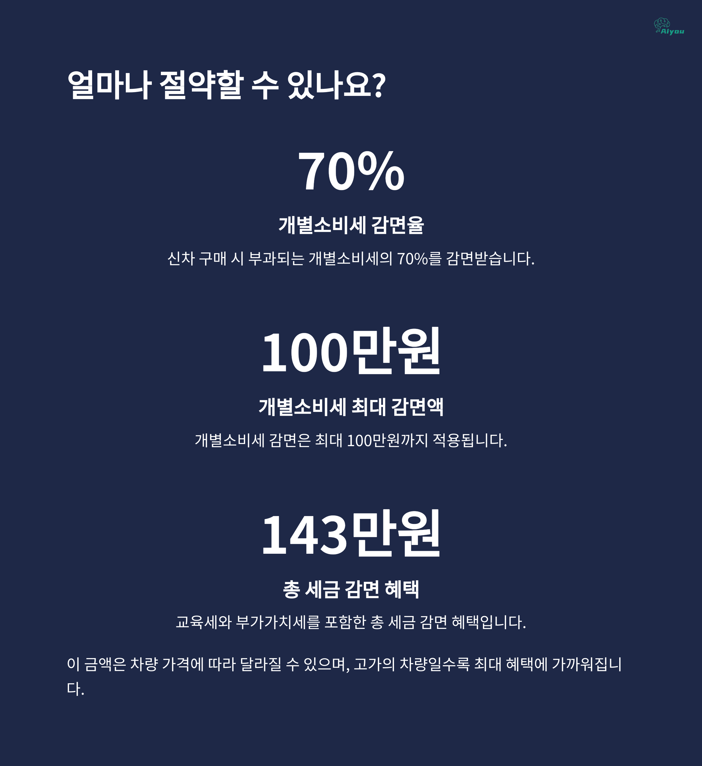 | 개별소비세 감면율 | 70% (최대 100만 원 한도) |