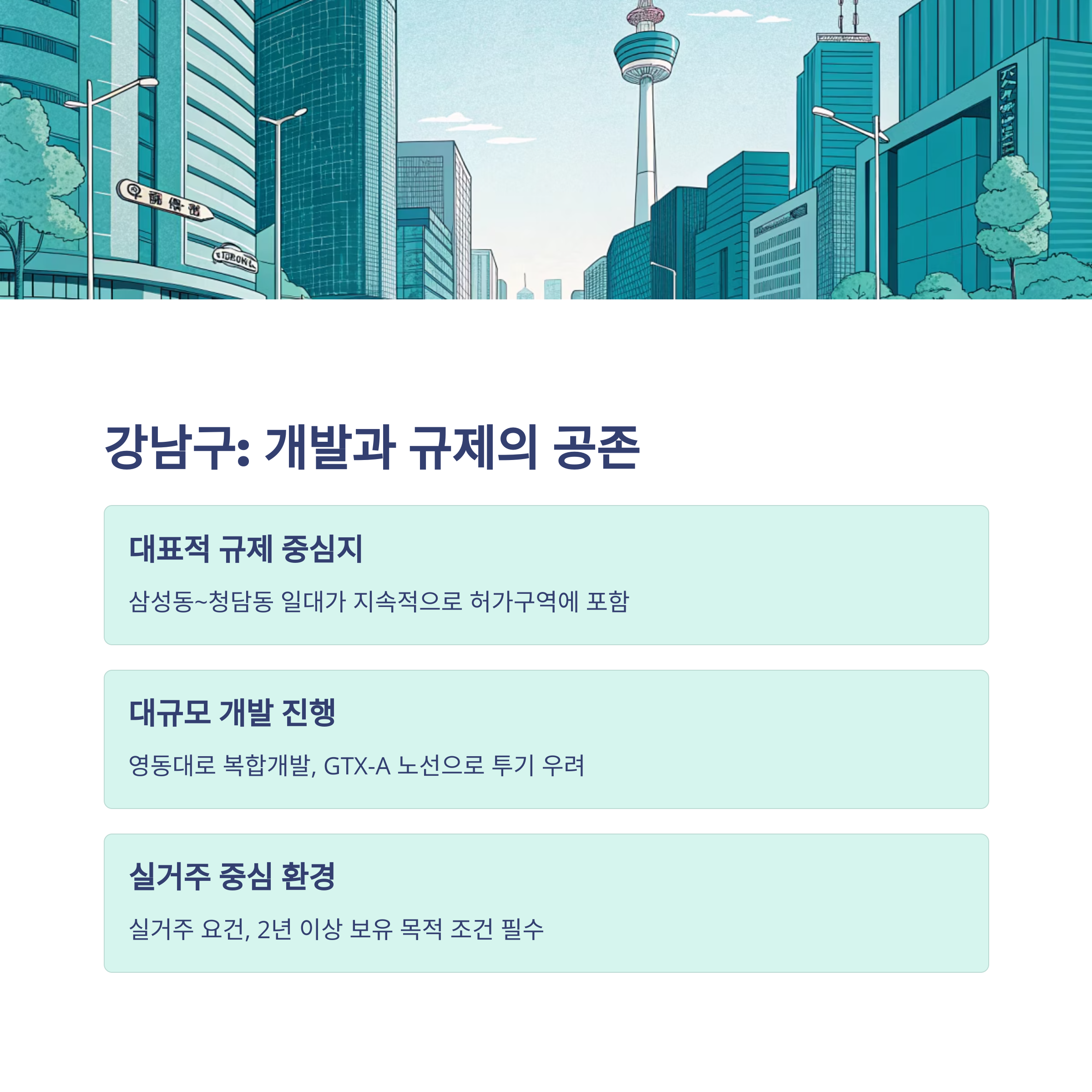 강남구는 대표적인 규제 중심지로, 삼성동~청담동 일대가 지속적으로 허가구역에 포함됩니다.