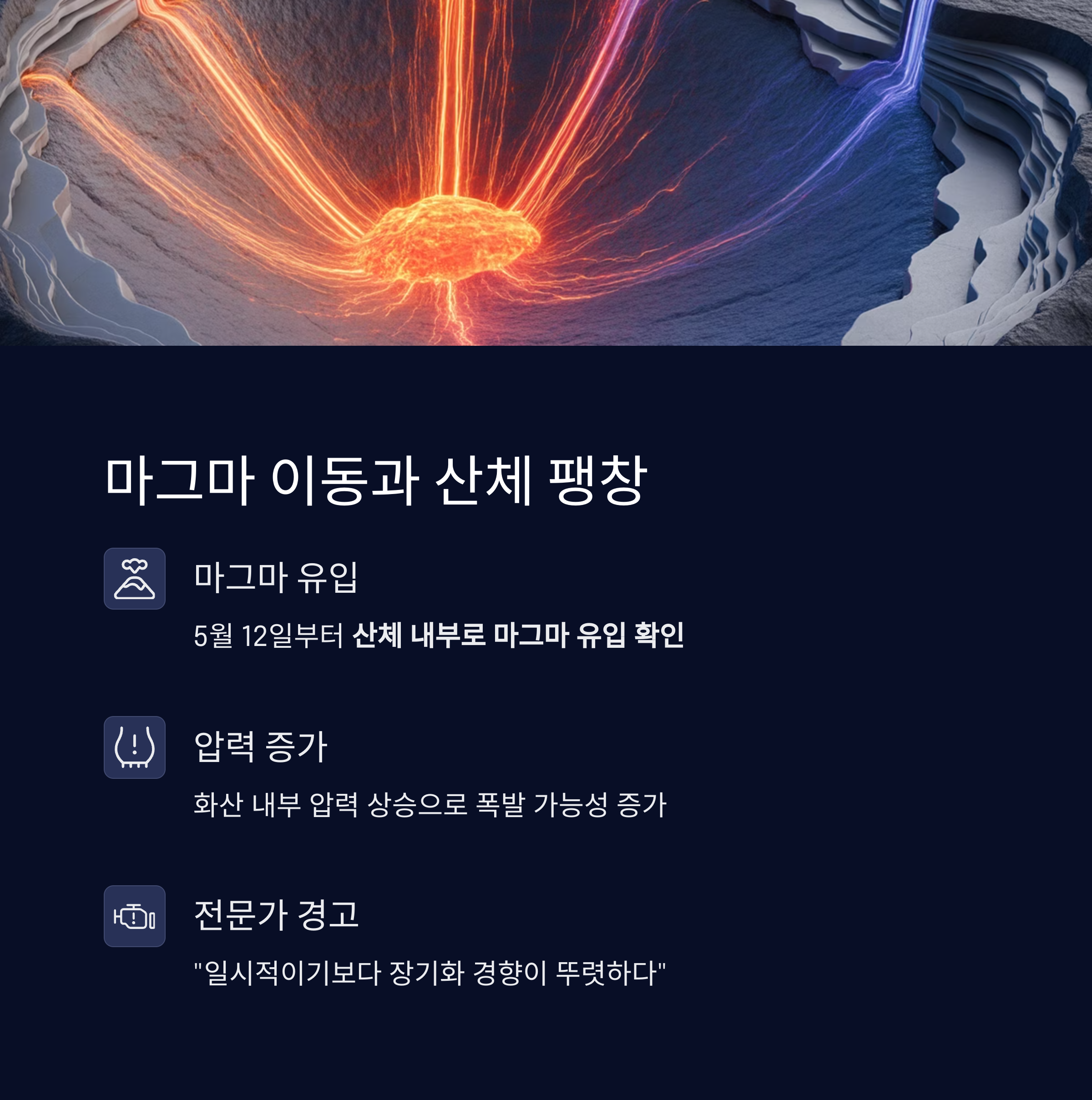 5월 12일부터는 마그마가 산체 내부로 유입되며 팽창 현상이 나타나고 있습니다.
