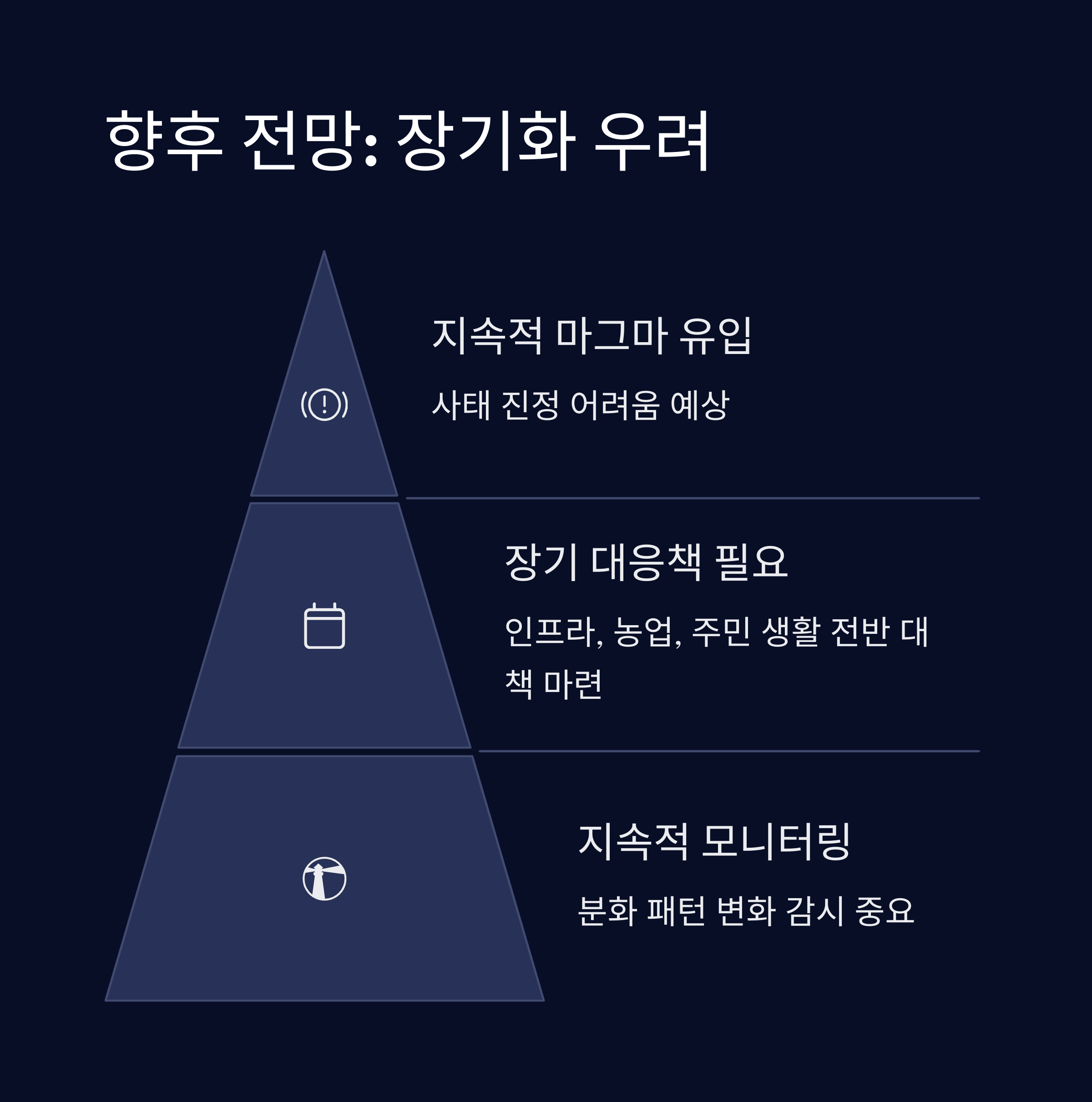 단기적인 분화 활동의 증가뿐 아니라 장기적 폭발 가능성까지도 우려되는 상황입니다.