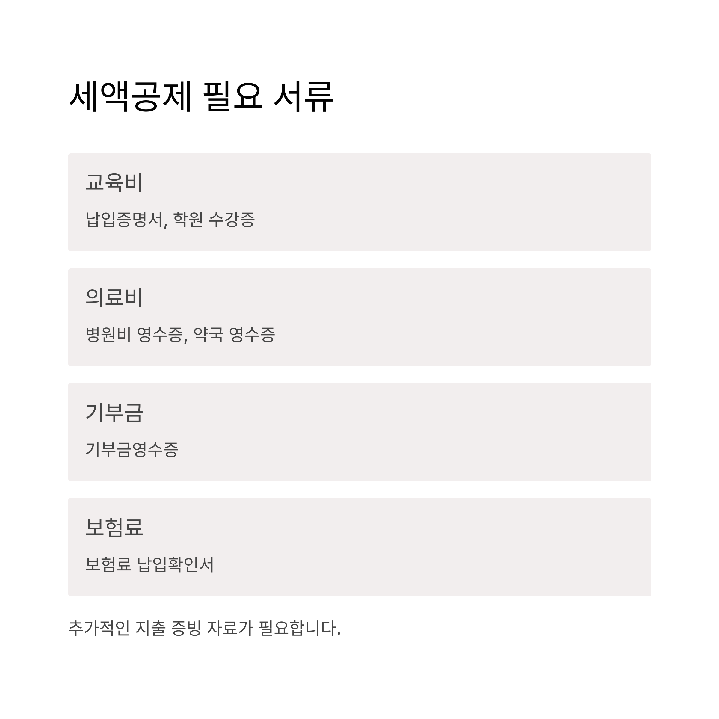 | 교육비 | 납입증명서, 학원 수강증 등 |