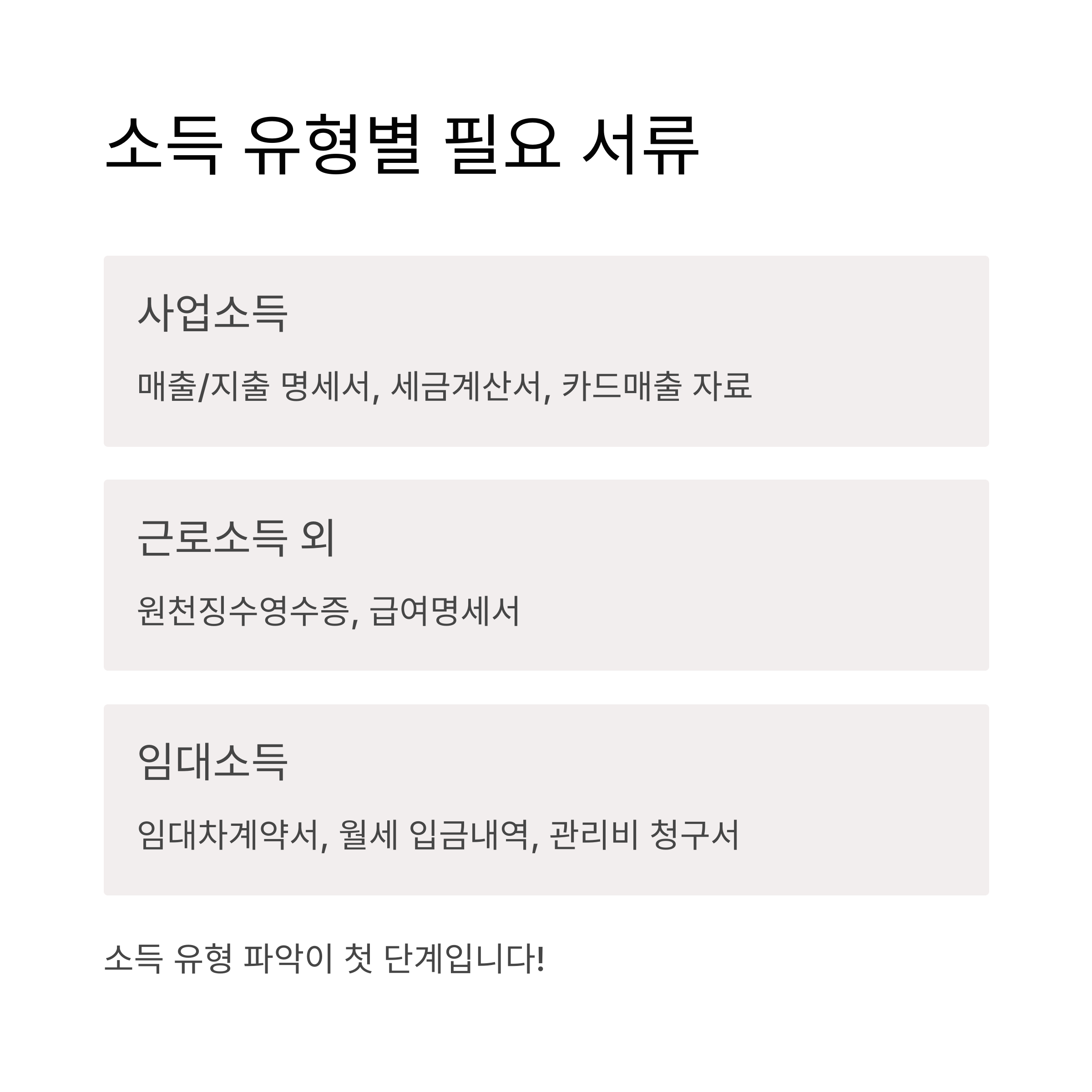 소득 유형에 따라 준비 서류도 달라지므로 먼저 본인의 소득 종류를 확인하는 것이 핵심입니다.