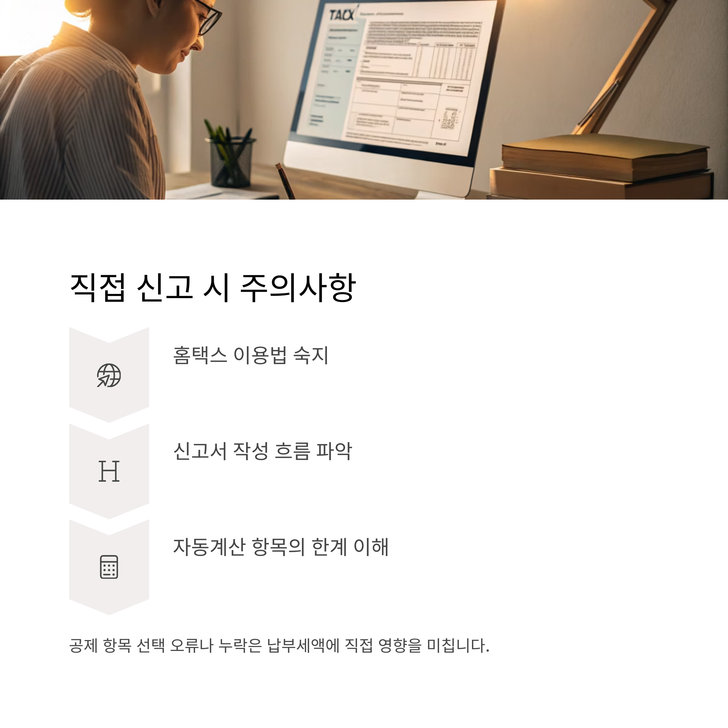 국세청 홈택스 이용법, 신고서 작성 흐름, 자동계산 항목의 한계 등을 사전에 익혀야 합니다.