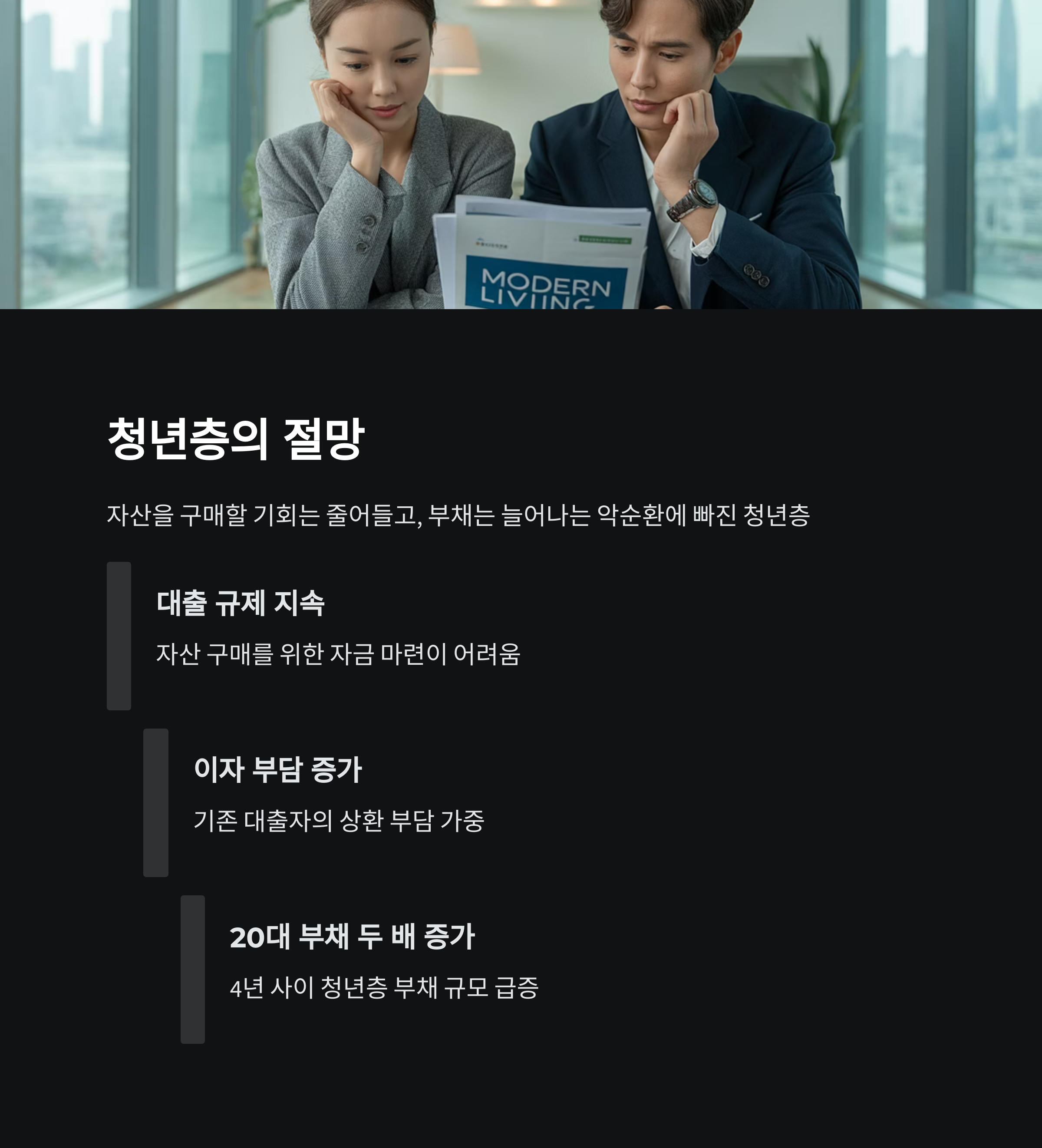 청년층은 자산을 쥘 기회 없이 빚만 안고 살아가고 있습니다.