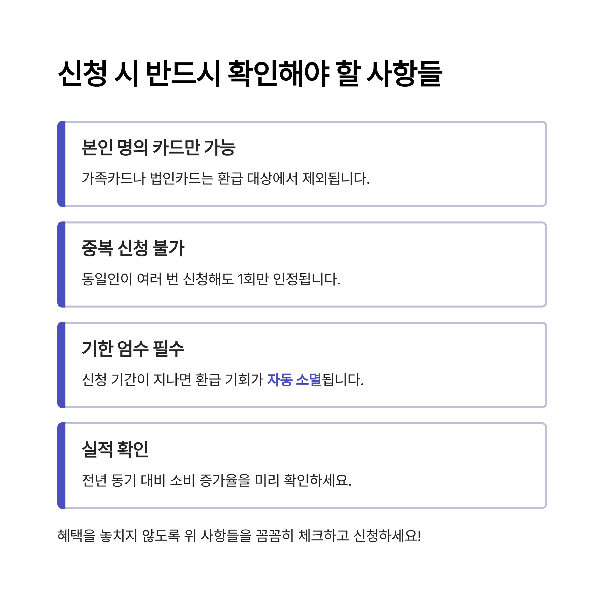 신청은 반드시 본인 명의 카드로만 가능하며, 가족카드나 법인카드는 제외됩니다. 또한 동일인이 중복 신청하는 것은 불가능합니다. 기간을 놓치면 자동 소멸되므로 반드시 기한을 확인해야 합니다.