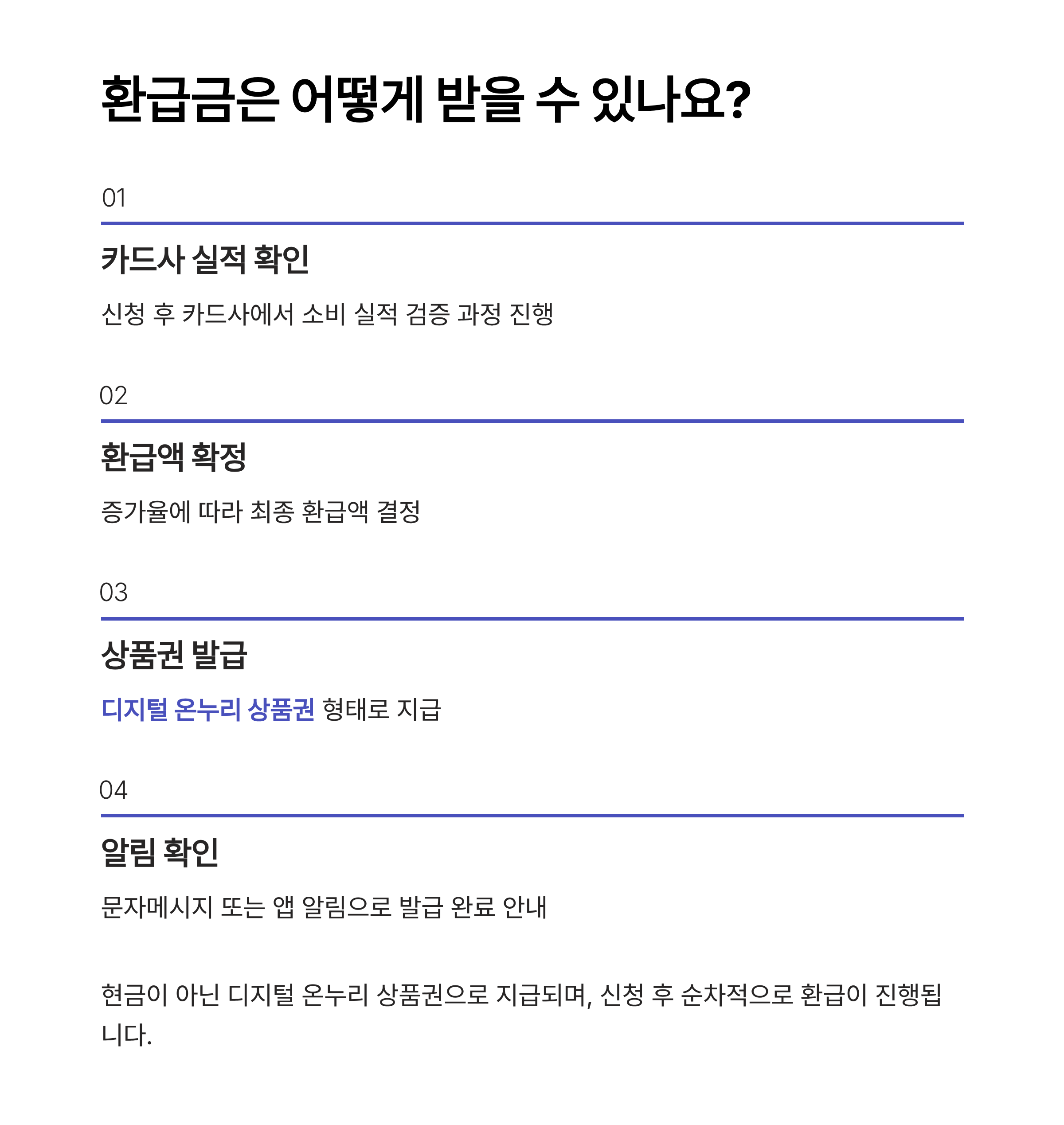 환급은 현금이 아닌 디지털 온누리 상품권 형태로 지급되며, 지정 가맹점에서 자유롭게 사용할 수 있습니다. 지급일은 신청 후 카드사 실적 확인을 거쳐 순차적으로 진행됩니다.