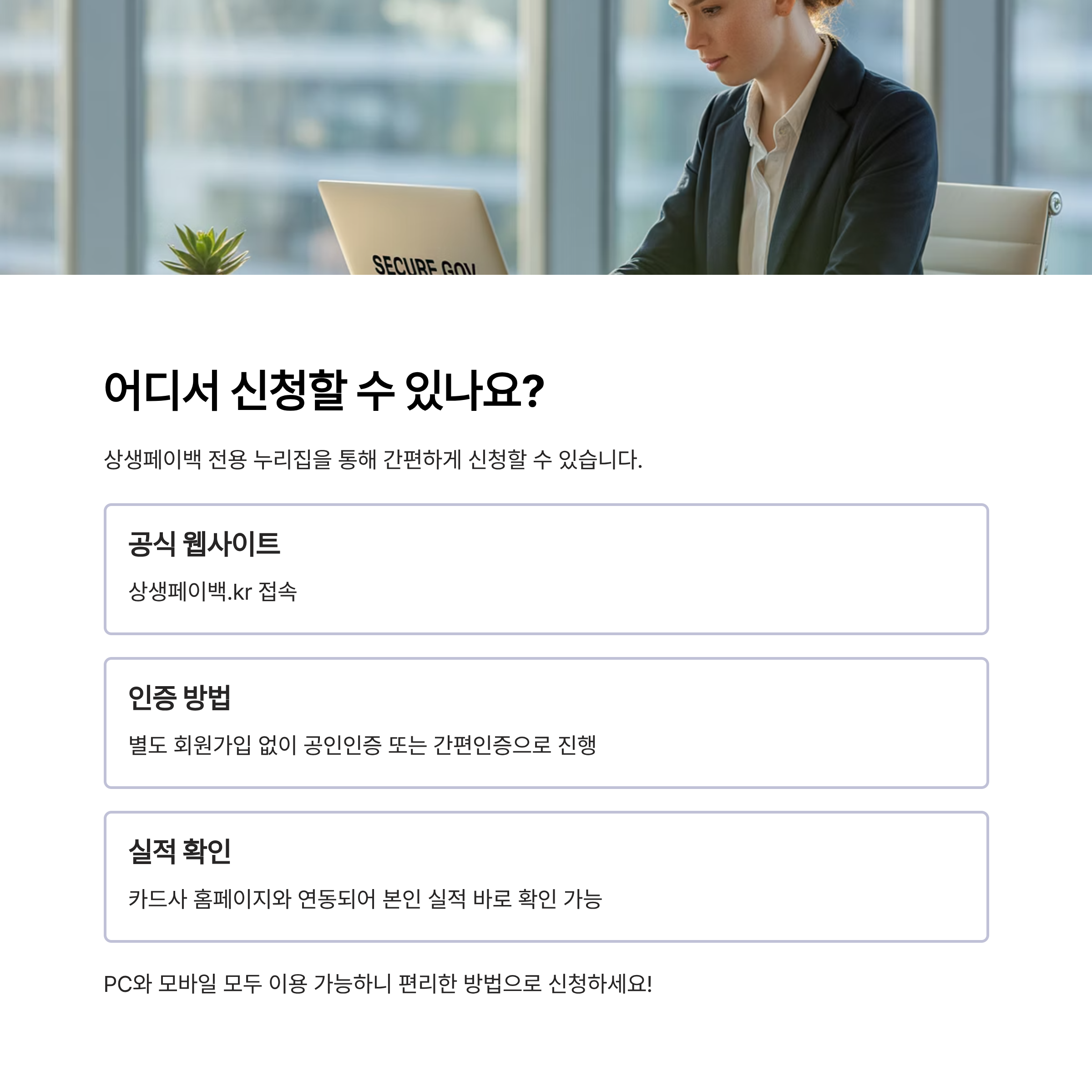 상생페이백 전용 홈페이지(상생페이백.kr)를 통해 신청할 수 있으며, 별도 회원가입 없이 공인인증이나 간편인증을 거쳐 진행됩니다. 카드사 홈페이지와 연동되어 본인 실적을 바로 확인할 수 있다는 점도 편리합니다.