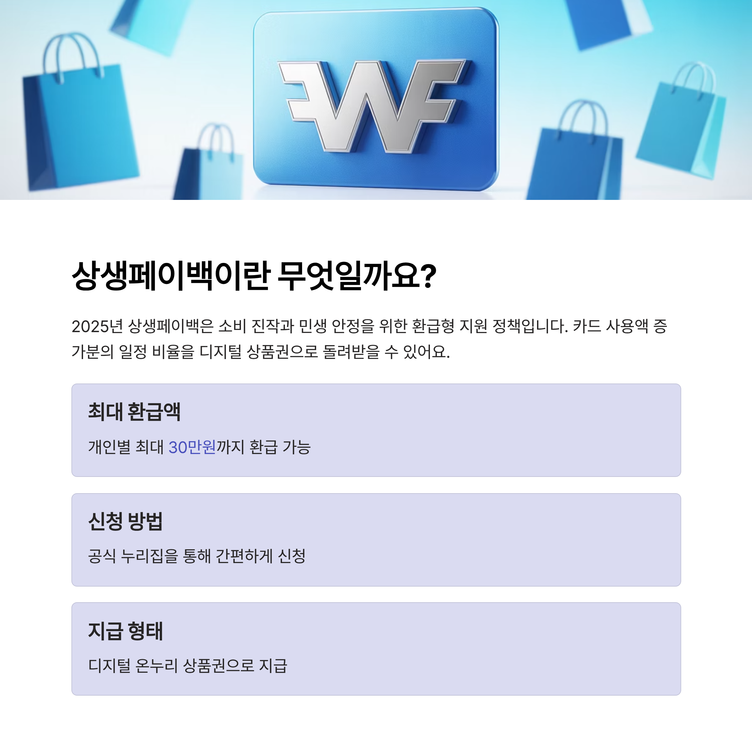 2025년 상생페이백 제도는 소비 진작과 민생 안정을 위해 마련된 환급형 지원 정책으로, 카드 사용액 증가분의 일정 비율을 디지털 상품권으로 돌려주는 방식입니다. 개인별 최대 30만원까지 환급이 가능하며, 공식 누리집을 통해 신청이 이뤄집니다. 신청 기간, 방법, 대상 조건 등을 미리 확인해 두면 빠짐없이 혜택을 챙길 수 있습니다.