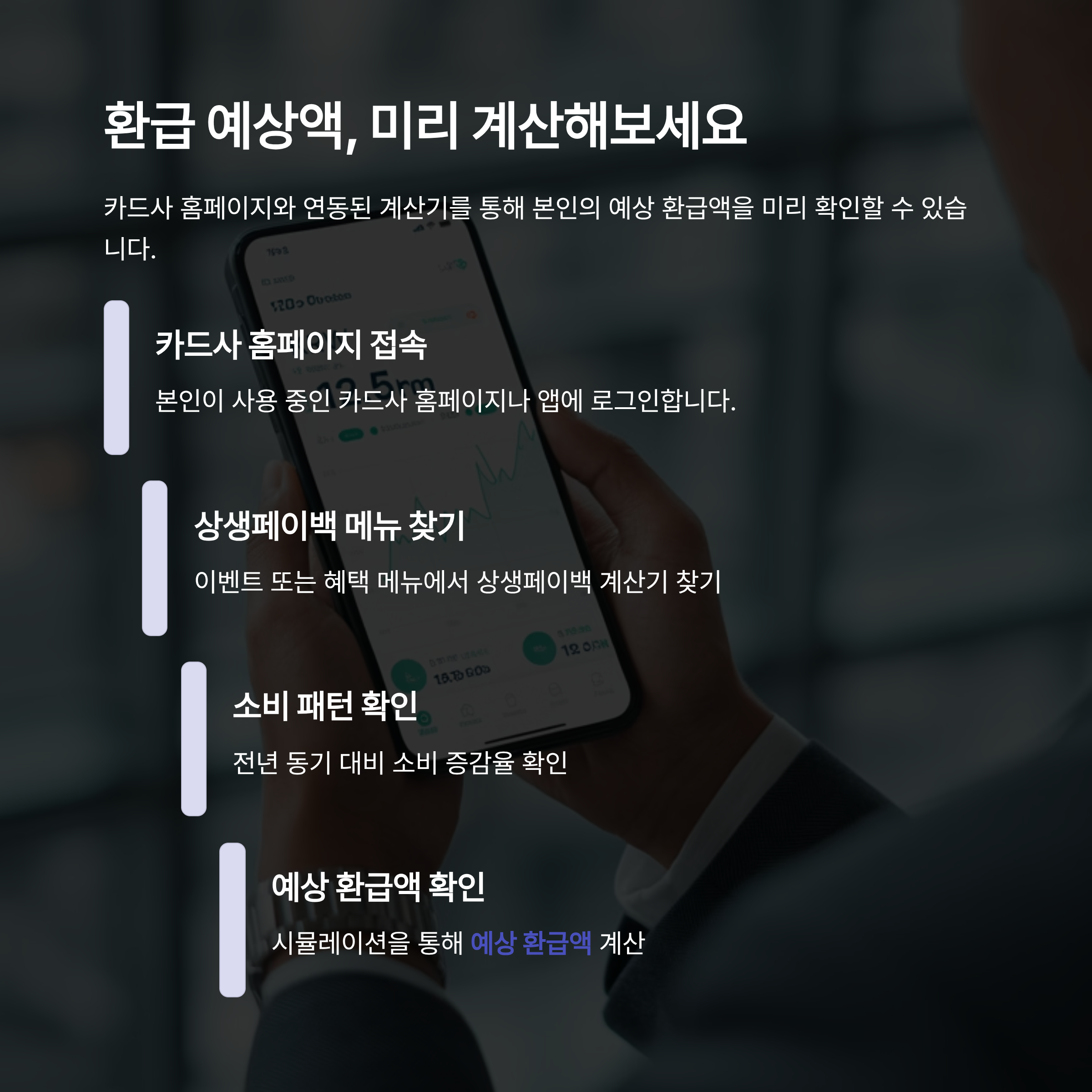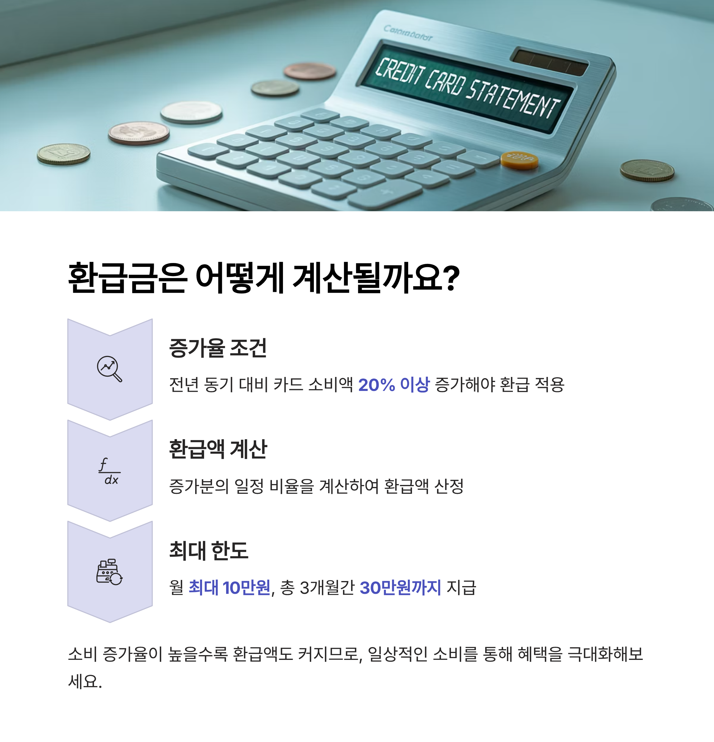 카드사 홈페이지와 연동된 계산기를 통해 본인의 예상 환급액을 미리 확인할 수 있습니다. 소비 증감율에 따라 받을 수 있는 금액이 달라지므로, 신청 전에 예상치를 확인해 보는 것이 좋습니다.