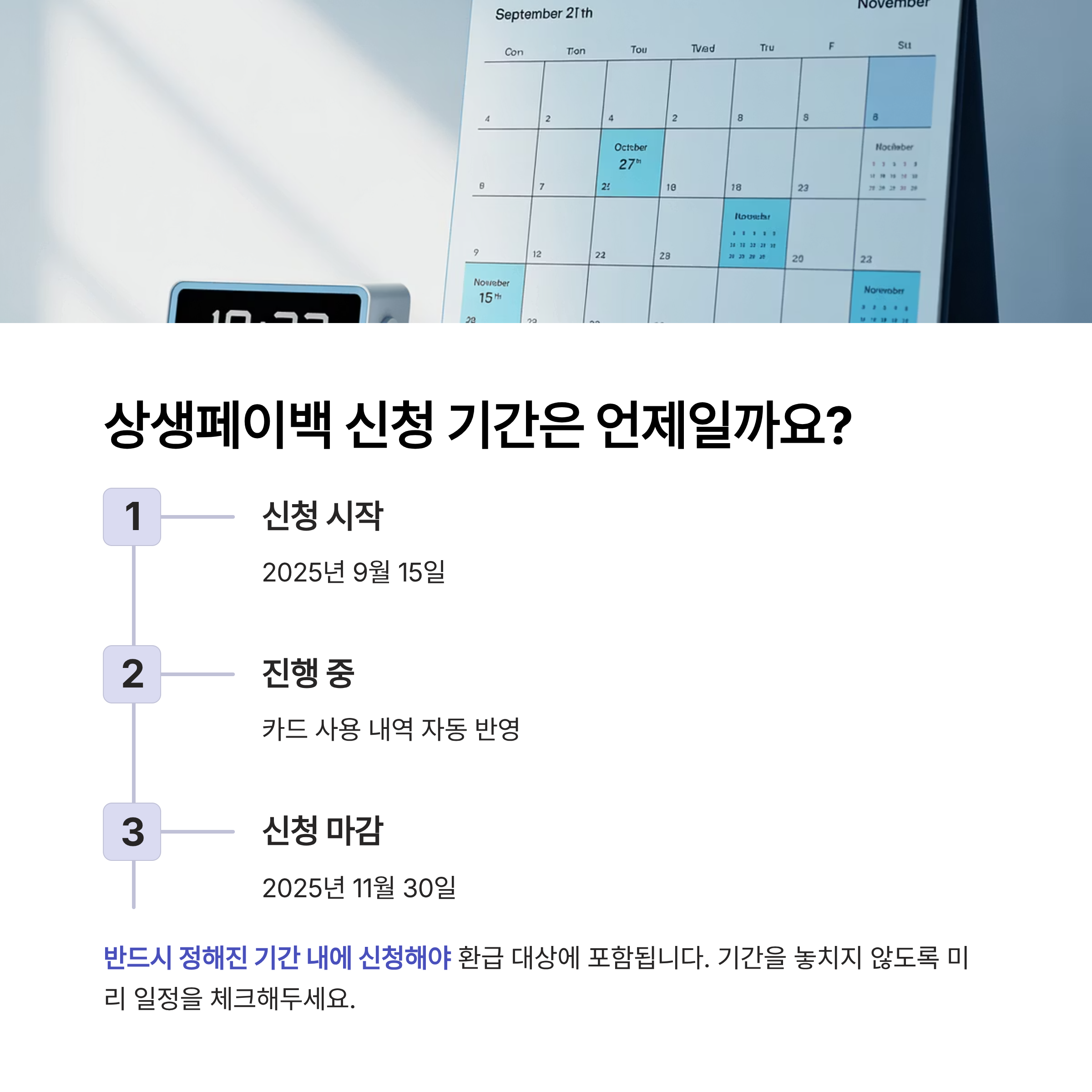 2025년 상생페이백은 9월 15일부터 11월 30일까지 신청이 가능합니다. 이 기간 동안 카드 사용 내역이 자동으로 반영되며, 반드시 정해진 기간 내에 신청해야 환급 대상에 포함됩니다.