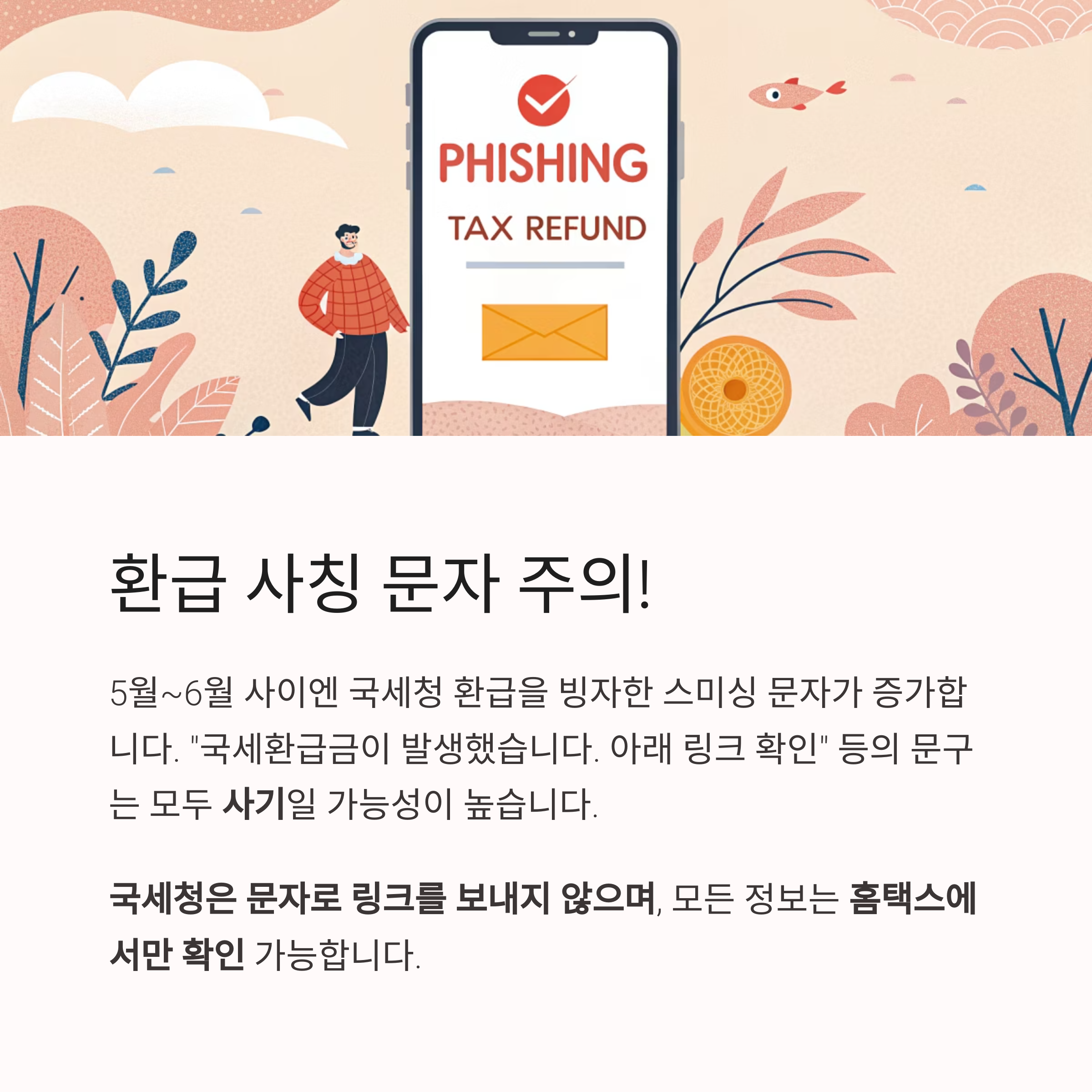 5월~6월 사이엔 국세청 환급을 빙자한 스미싱 문자도 증가합니다.