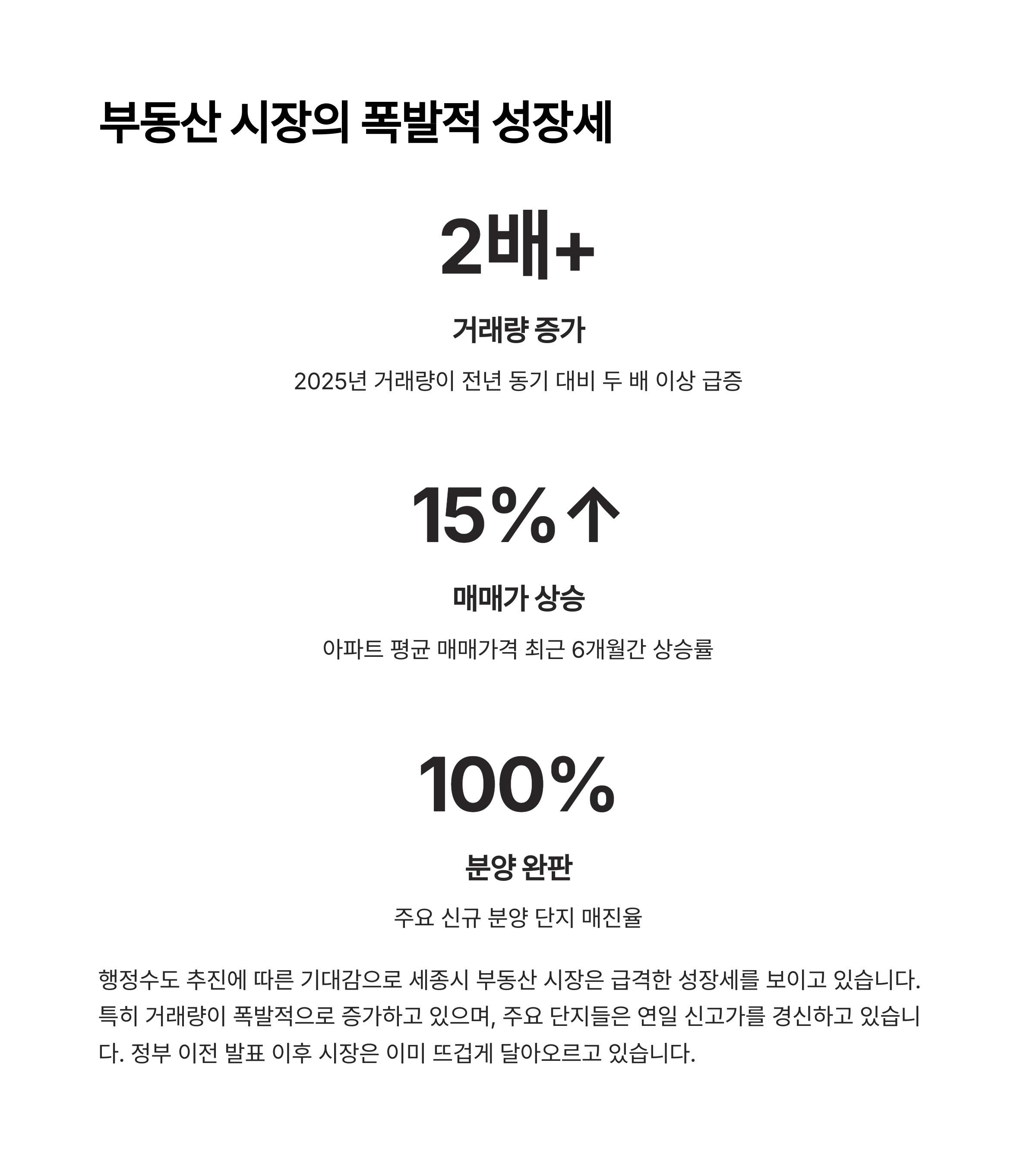 - 정책 기대감: 국회·대통령 집무실 완전 이전 추진, 추가 공공기관 이전, 스마트시티 등 국가 주도 프로젝트로 투자 심리 자극