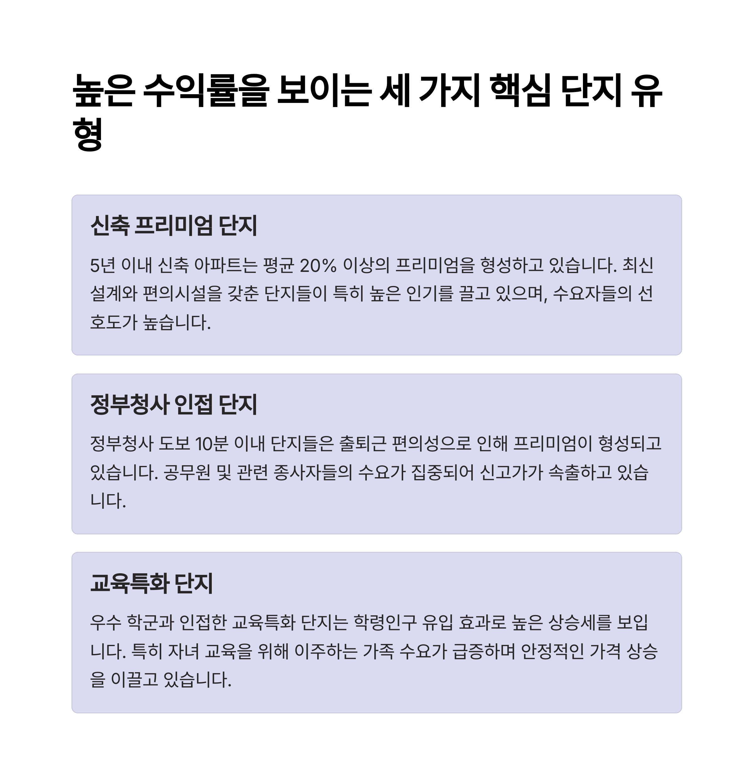 - 정부청사·교육특화 단지, 신축 분양 단지 중심으로 선별 투자 권장