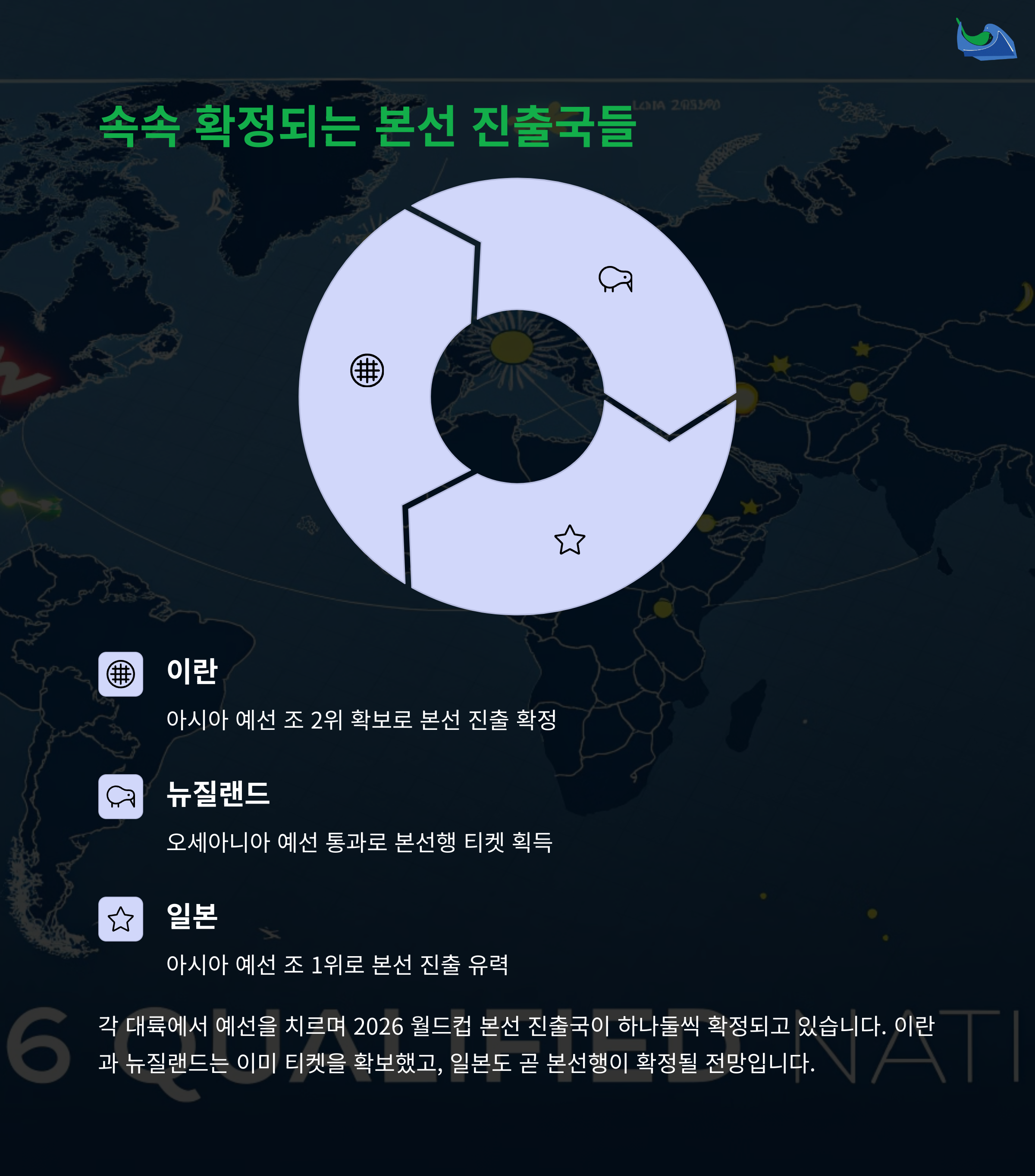 이란과 뉴질랜드의 본선 진출 또한 주목할 만합니다. 이란은 우즈베키스탄과의 경기에서 무승부라는 결과를 얻었음에도 조 2위를 지켜내며 안정적으로 본선행을 확정했습니다. 중동권의 강호로 꼽히는 이란의 전력은 매 대회마다 기대를 모으고 있으며, 체력과 기술이 균형 잡힌 팀으로 평가받고 있습니다. 뉴질랜드는 오세아니아 예선을 통과하며 또 한 번 월드컵 무대를 밟게 되었는데, 경기력뿐만 아니라 팀워크를 중시하는 경기 운영이 강점으로 작용할 전망입니다.