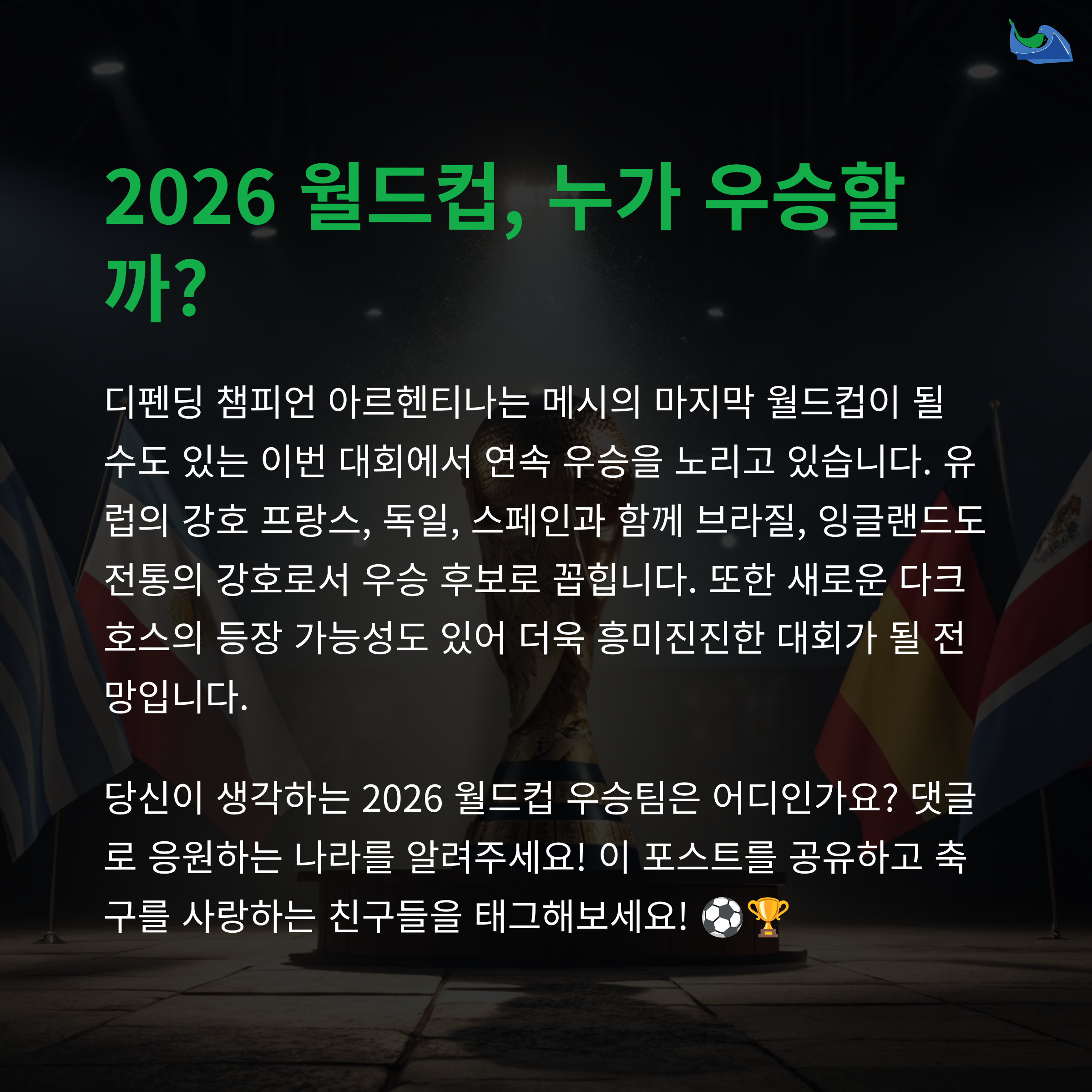 여러분은 어떤 국가가 2026년 월드컵 우승을 차지할 것으로 예상하시나요? 댓글로 여러분의 예측을 공유해 주세요! 여러분의 생각이 이 글을 더욱 풍성하게 만들어줍니다.