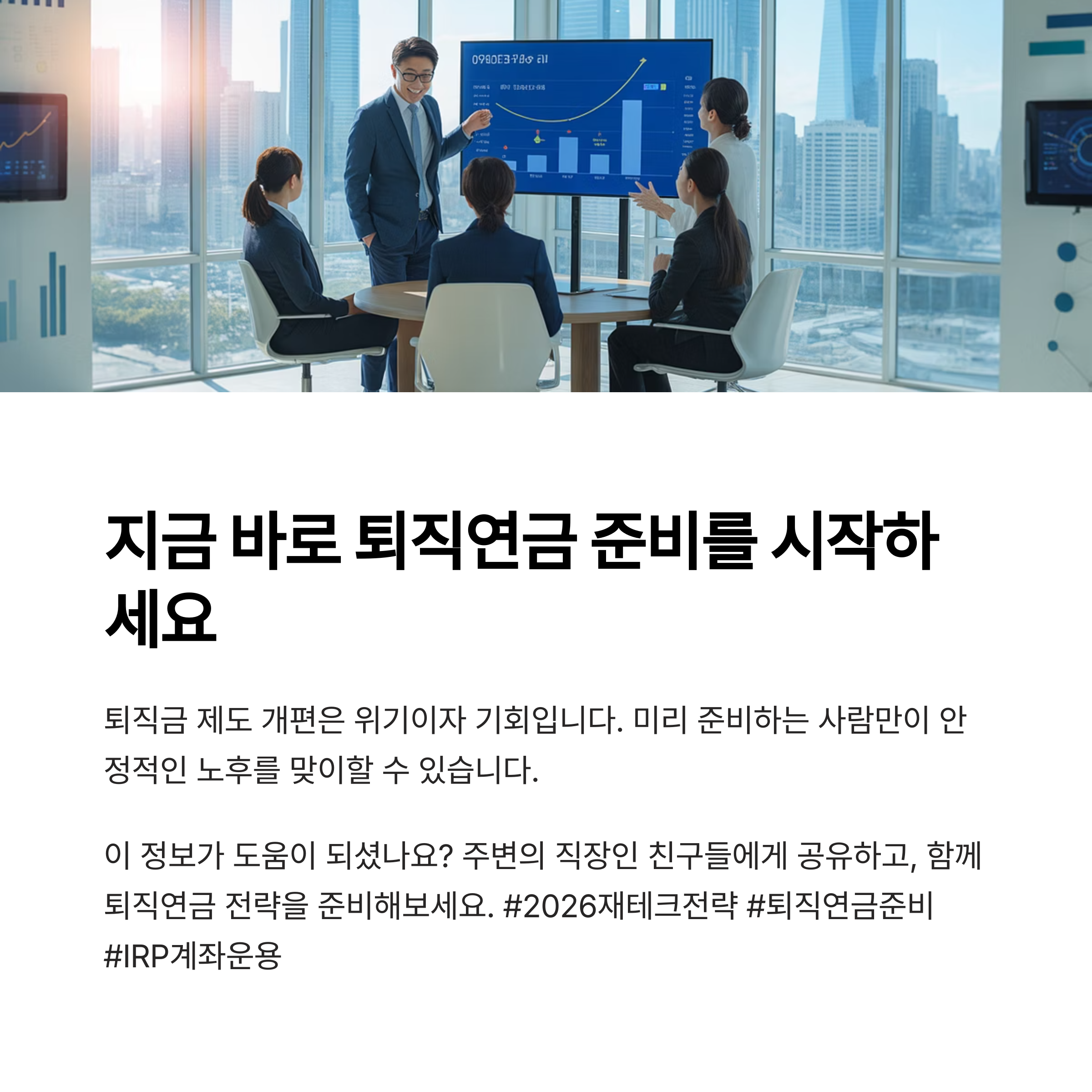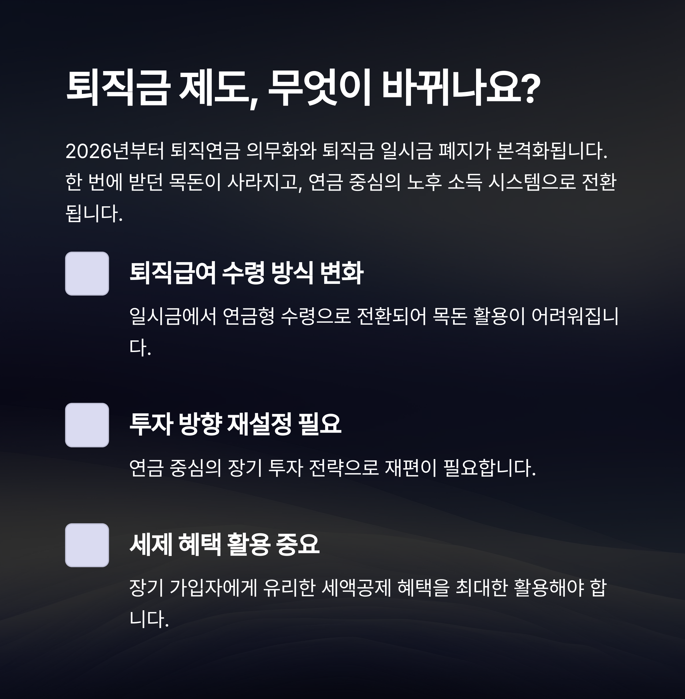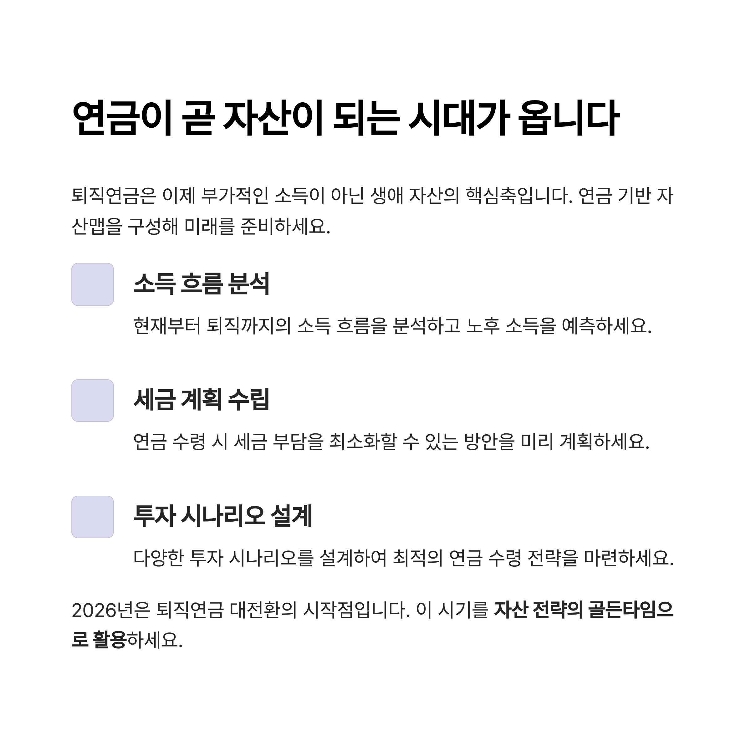 2026년은 퇴직연금 대전환의 시작점입니다. 이 시기를 단순히 정책 변화가 아닌, 자산 전략의 골든타임으로 활용해야 합니다.