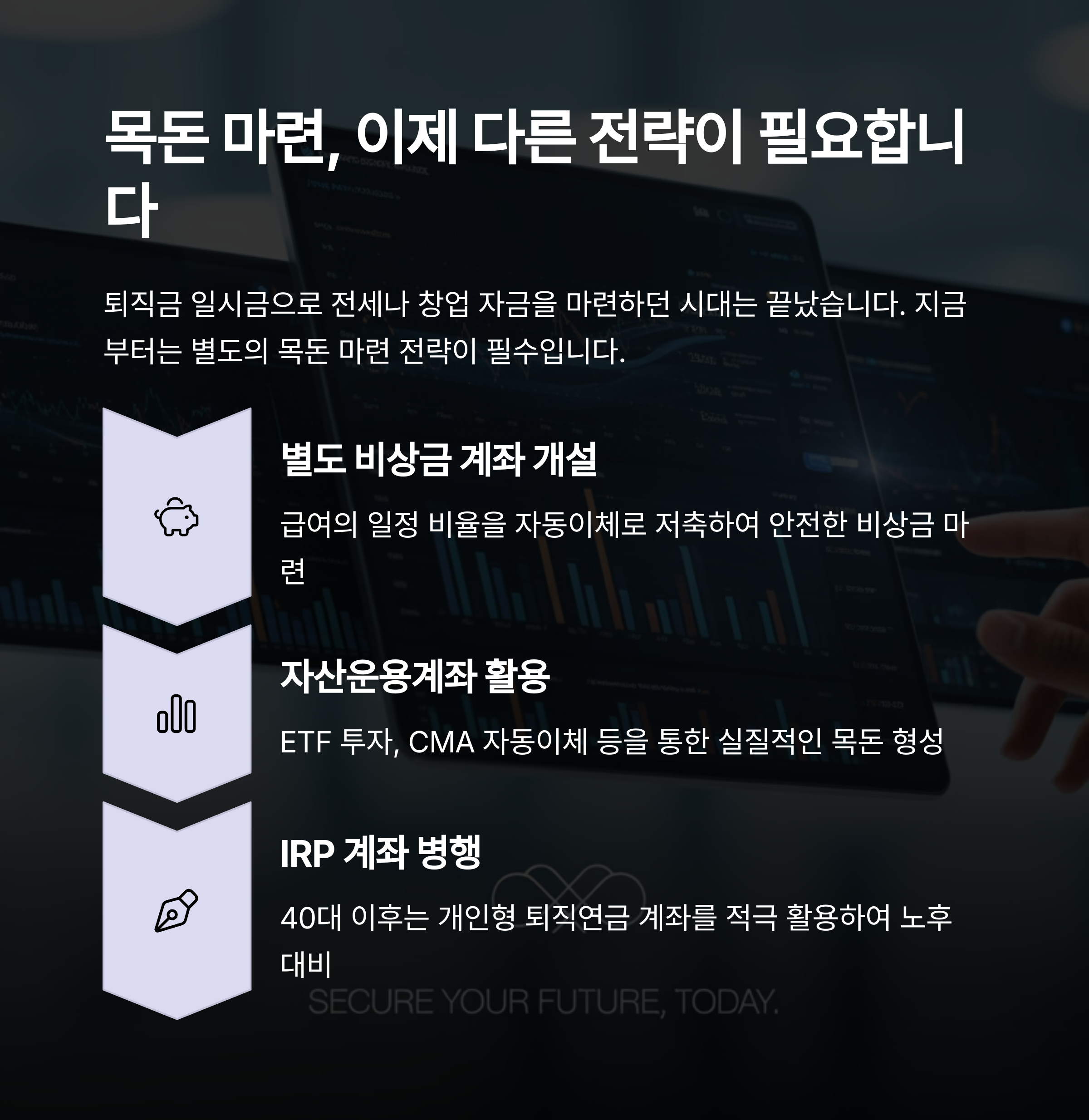 따라서 직장인은 기존 퇴직금을 기대하기보다, 별도 비상금 계좌나 자산운용계좌를 통해 실질적인 ‘목돈 마련’ 전략을 세워야 합니다. 특히 40대 이후는 IRP(개인형 퇴직연금) 계좌 외에 ETF 투자, CMA 자동이체 등의 병행이 필요합니다.
