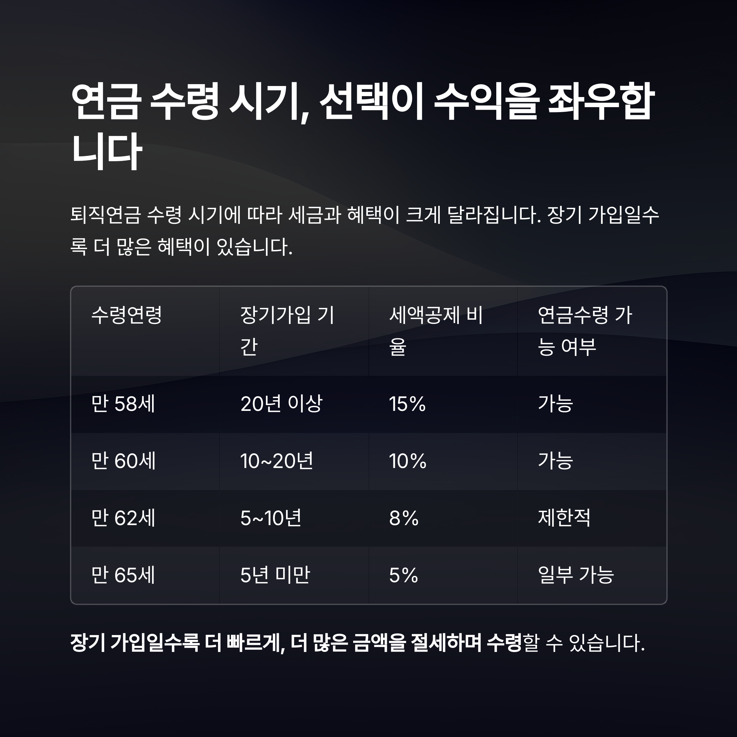 퇴직연금 수령 시기는 투자 수익률과 별개로 수령연령에 따라 세금과 혜택이 달라집니다.