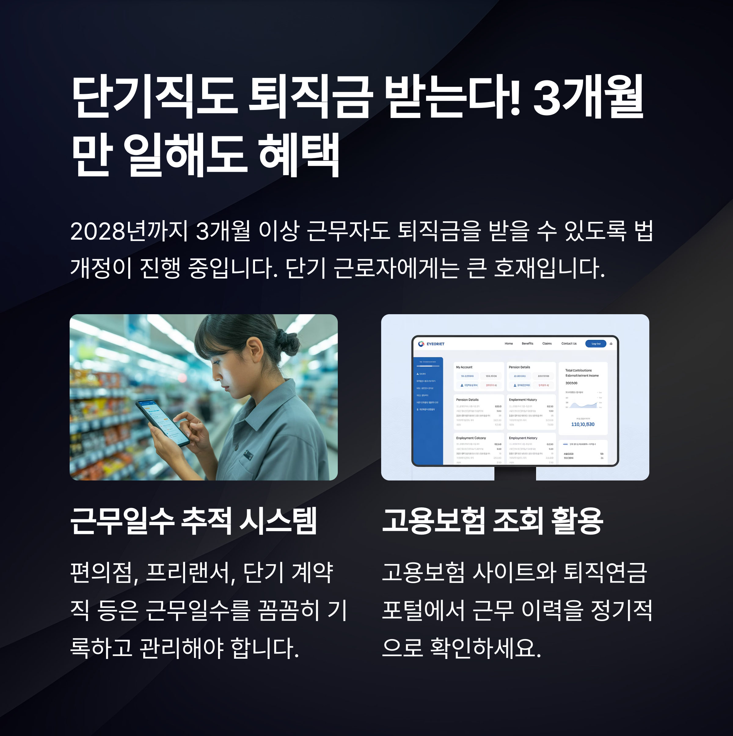편의점, 프리랜서, 단기 계약직 등은 근무일수 추적 및 퇴직급여 발생 여부 기록 시스템을 개인적으로 갖춰야 합니다. 고용보험 사이트나 퇴직연금포털에서 근무 이력 자동 조회 기능을 활용해 놓치는 급여가 없도록 대비하는 것이 필수입니다.
