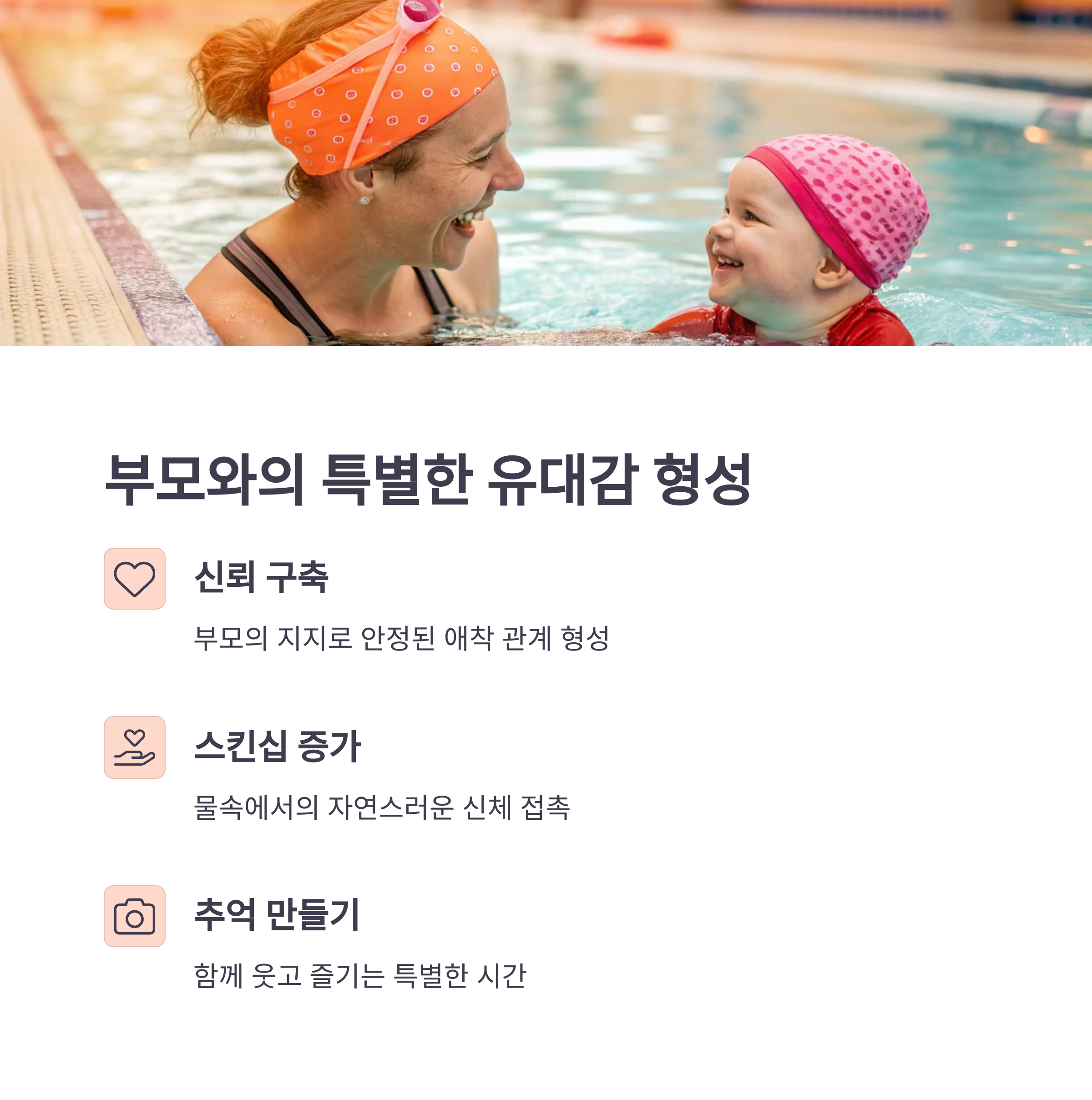 부모가 함께 수영장에 들어가서 아기를 도와주는 과정은 신뢰 형성과 안정된 애착 관계를 만들어 줍니다.
