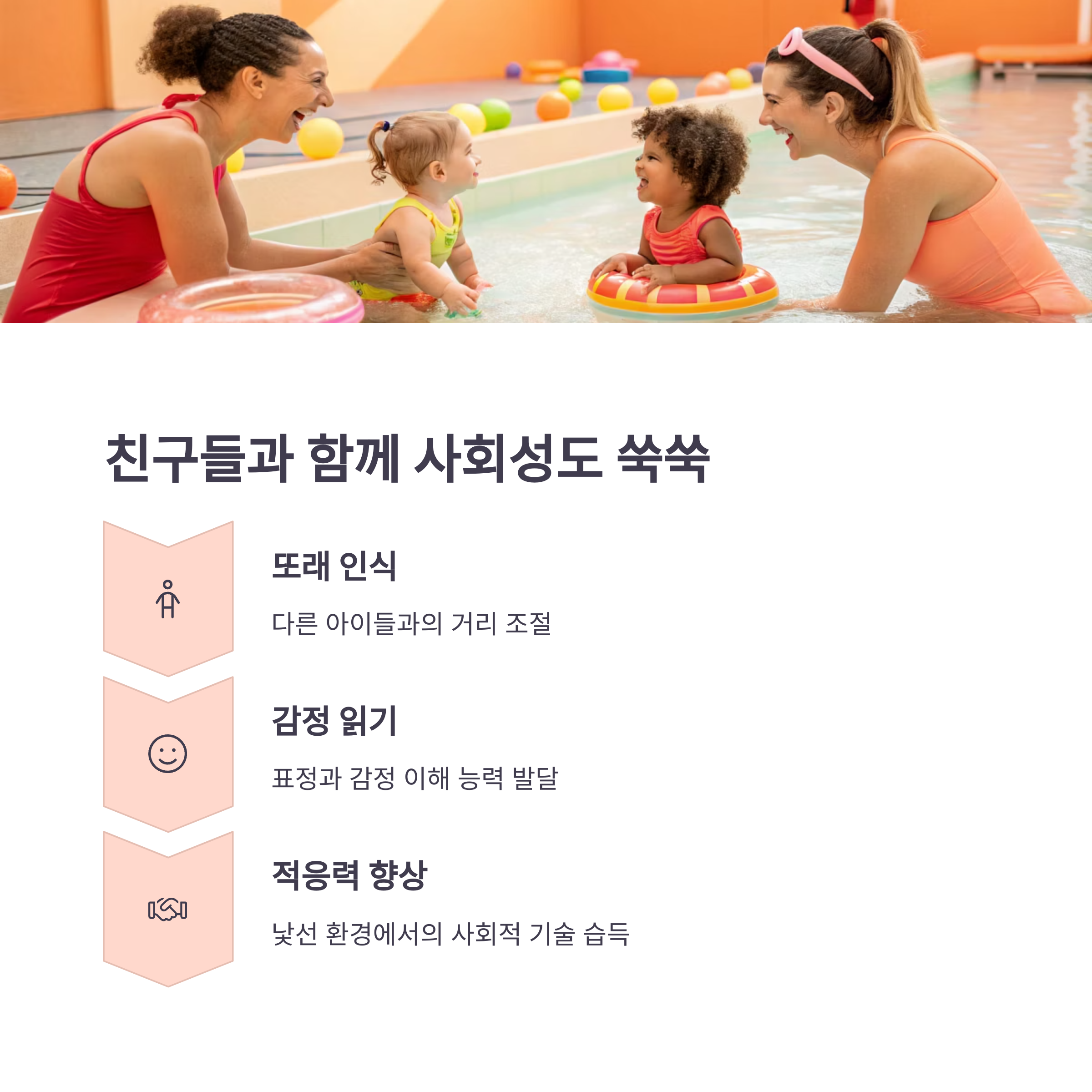 아기들은 물속에서 함께 움직이며 자연스럽게 다른 아이들과의 거리를 조절하고, 표정과 감정을 읽는 능력을 키웁니다.