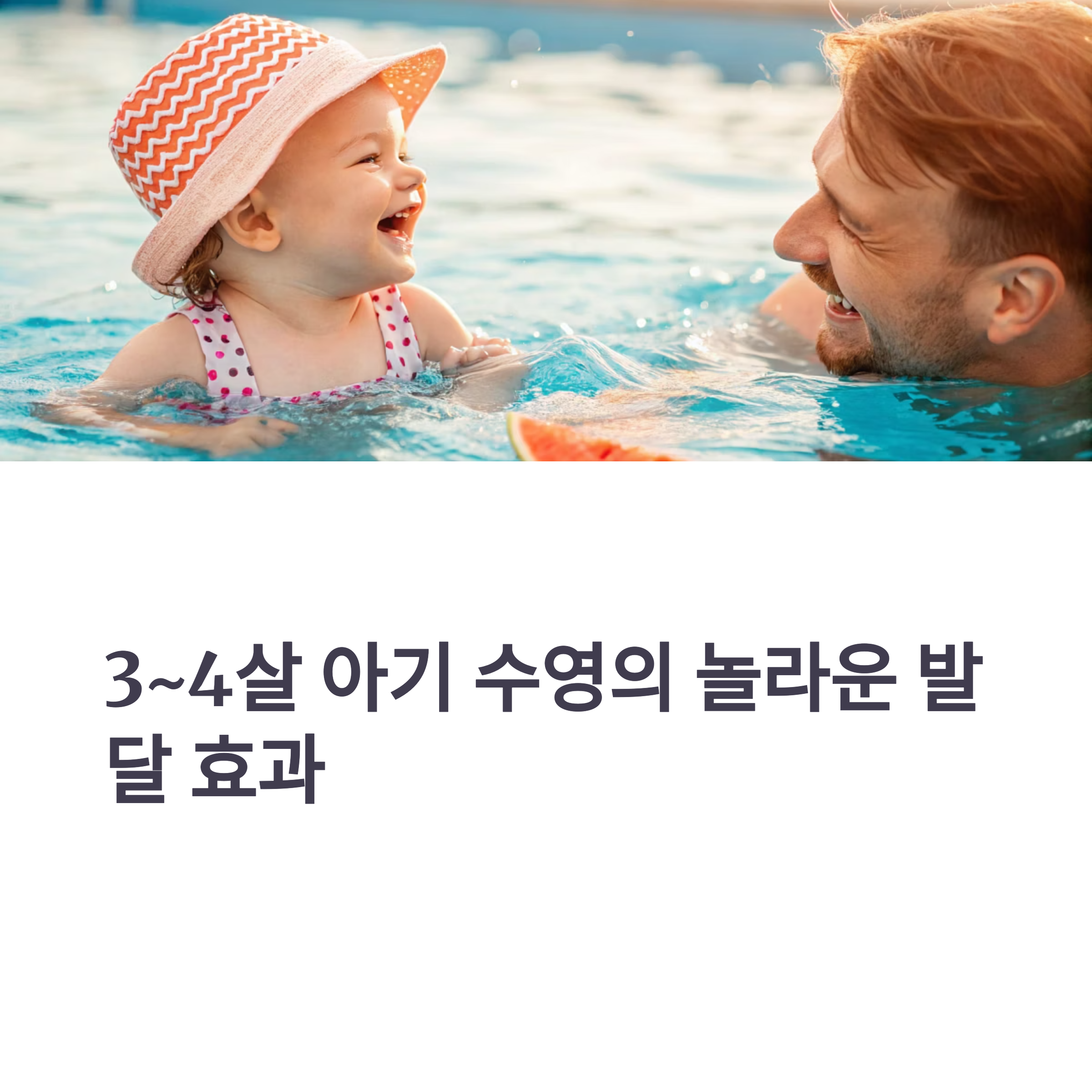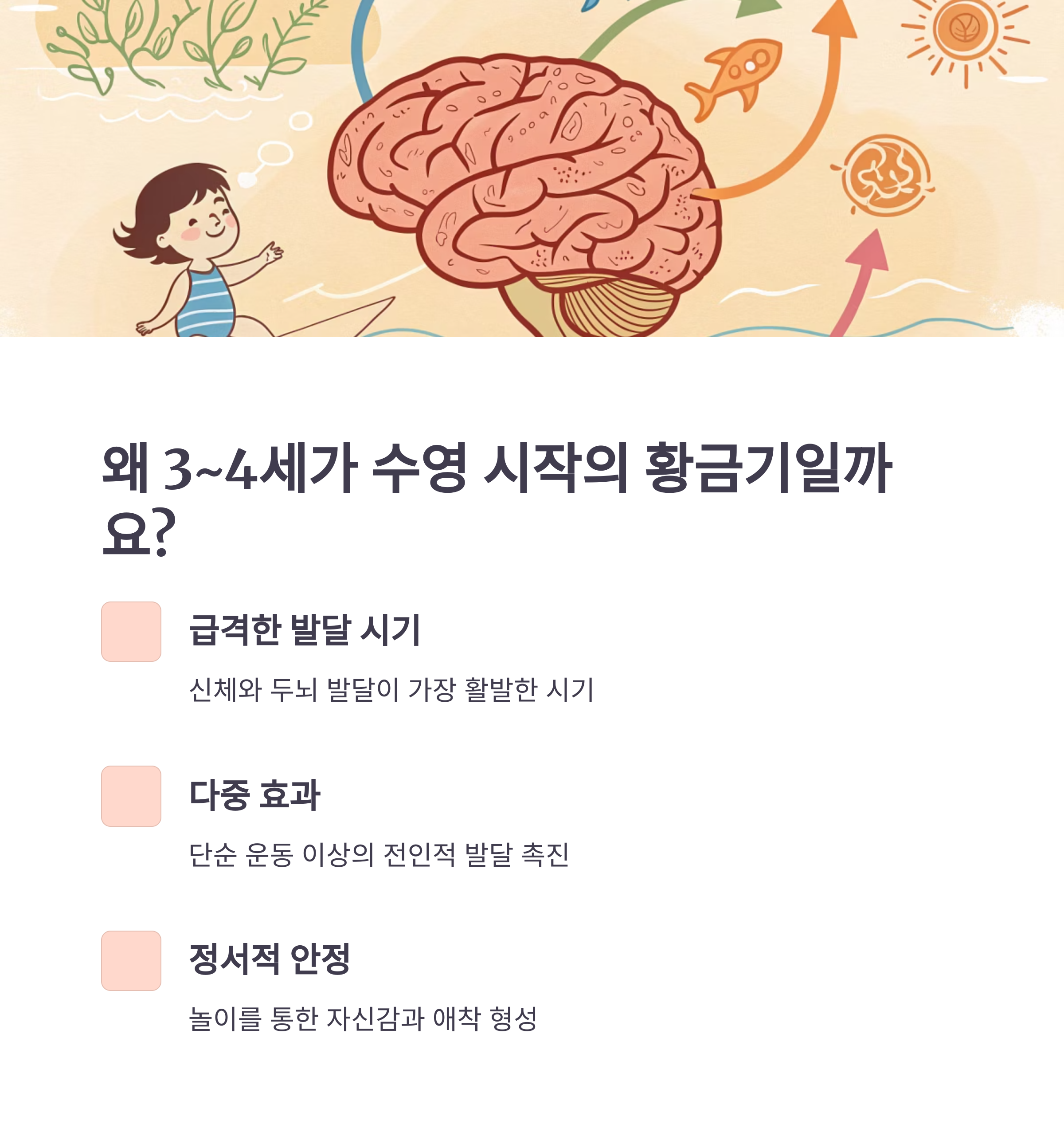 3~4세는 신체와 두뇌 발달이 급격히 이루어지는 시기로, 수영을 통한 감각 자극과 운동 능력 향상이 가장 효과적인 시기입니다.