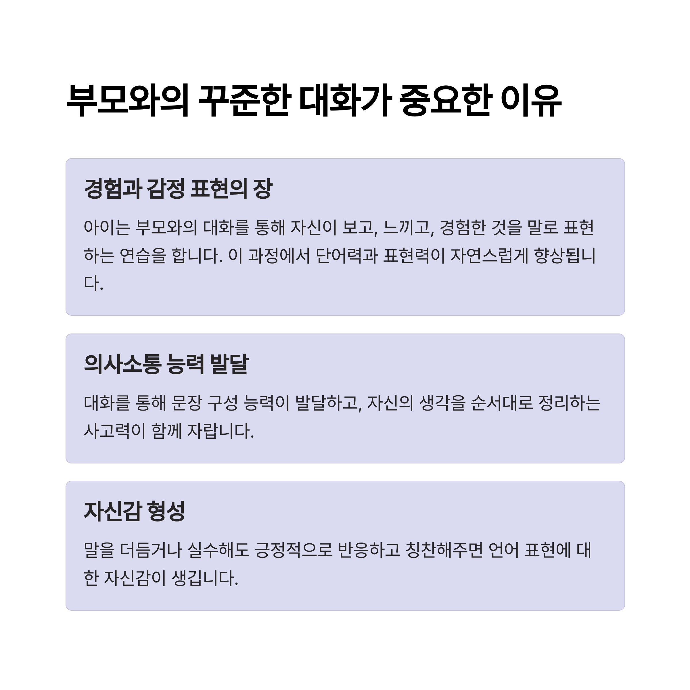 말이 늦는 아이도, 말이 많은 아이도 결국 부모와의 '대화 질'에 따라 언어력이 달라집니다. 무작정 말 걸기보다는 아이의 말에 공감하고 이어주는 방식이 중요해요. 대답이 없다고 포기하지 말고, 말이 이어지도록 도와주는 질문이나 리액션을 자주 넣어보세요.