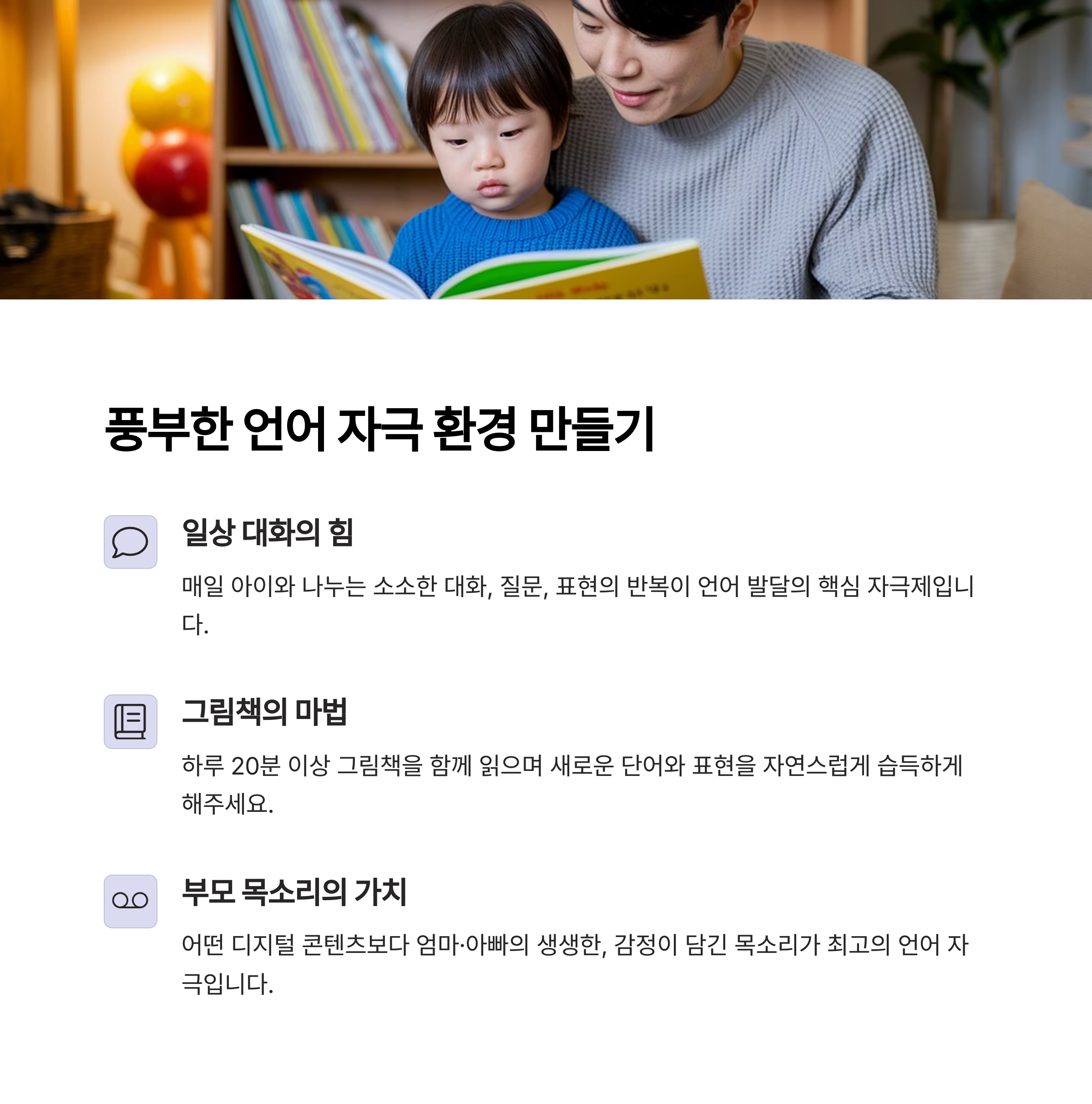 말을 잘하게 하려면 우선 '잘 듣는 환경'을 만들어야 해요. 언어는 듣고, 이해하고, 반복하면서 자라나니까요. 매일 다양한 상황에서 아이가 언어를 들을 수 있도록 도와주는 것만으로도 말이 술술 트이기 시작합니다.