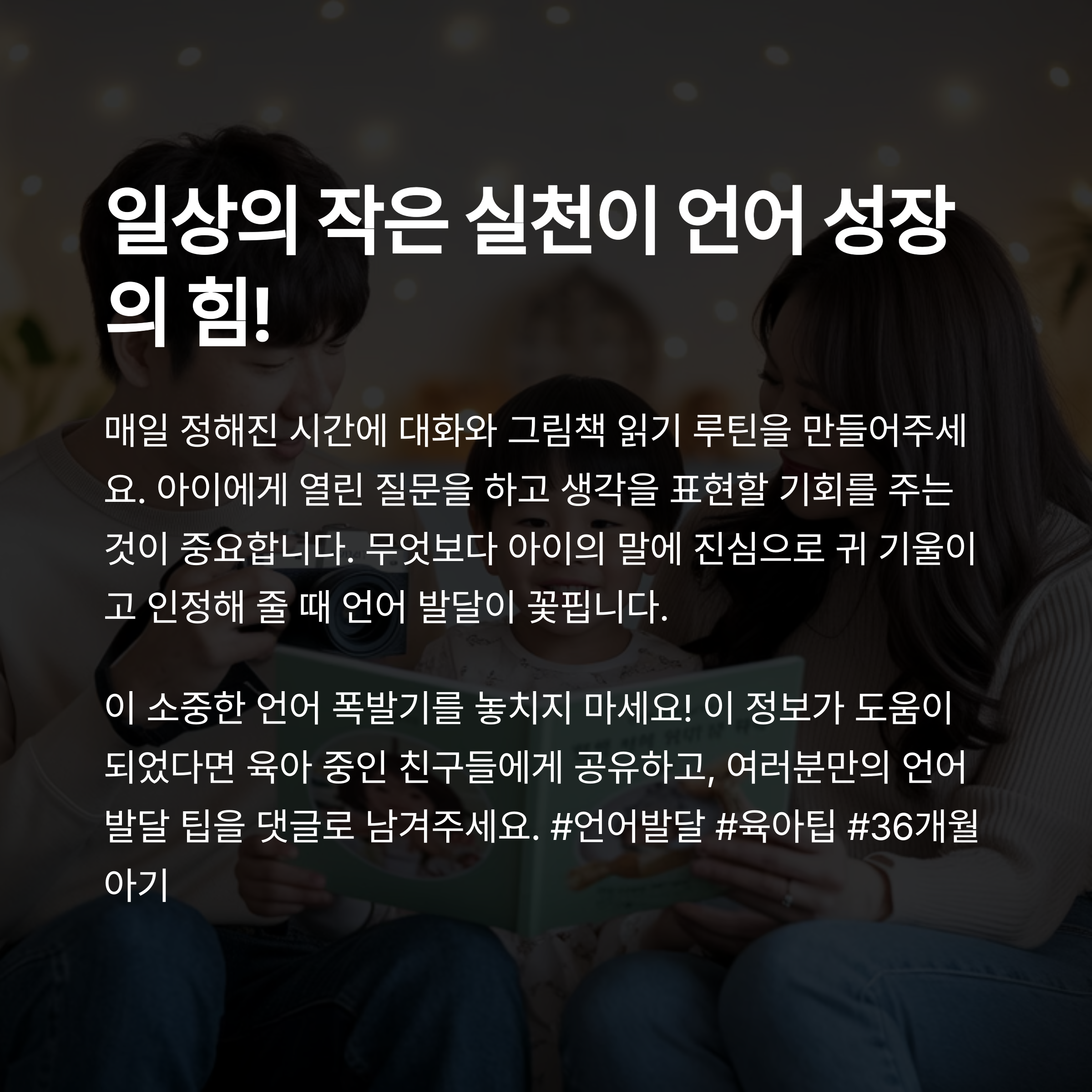 36개월 이후의 언어 폭발기를 어떻게 보내느냐는 아이 인생 전체에 영향을 줄 수 있어요. 어렵게 느껴지실 수도 있지만, 사실 매일의 사소한 루틴만으로도 큰 변화를 만들 수 있답니다. 우리 아이가 스스로 말하고 생각을 표현하는 기쁨을 누릴 수 있도록, 오늘부터 한 가지씩 실천해보는 건 어떨까요? 다른 부모님들은 어떻게 하고 계신지도 댓글로 공유해 주세요! 여러분의 이야기가 또 다른 부모에게 큰 힘이 될 수 있어요 😊