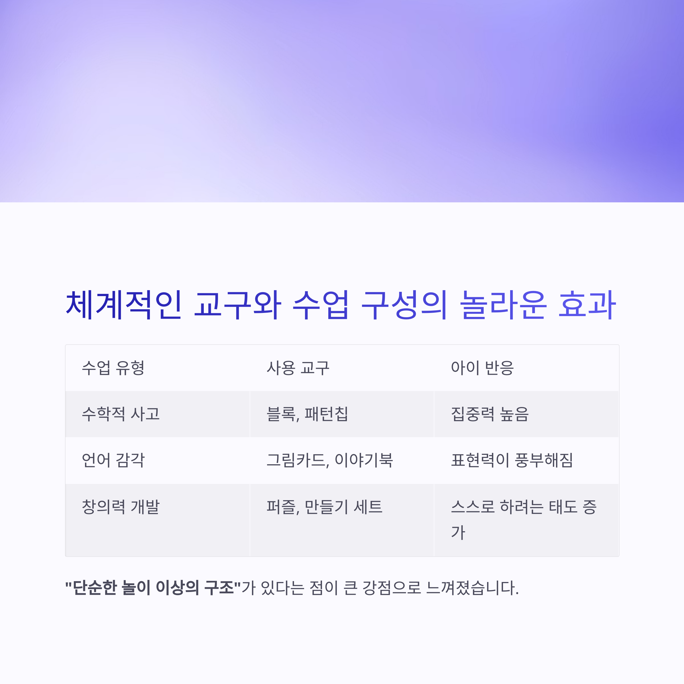 인지 발달과 사고력을 자극하는 교구 활용이 체계적이었습니다.