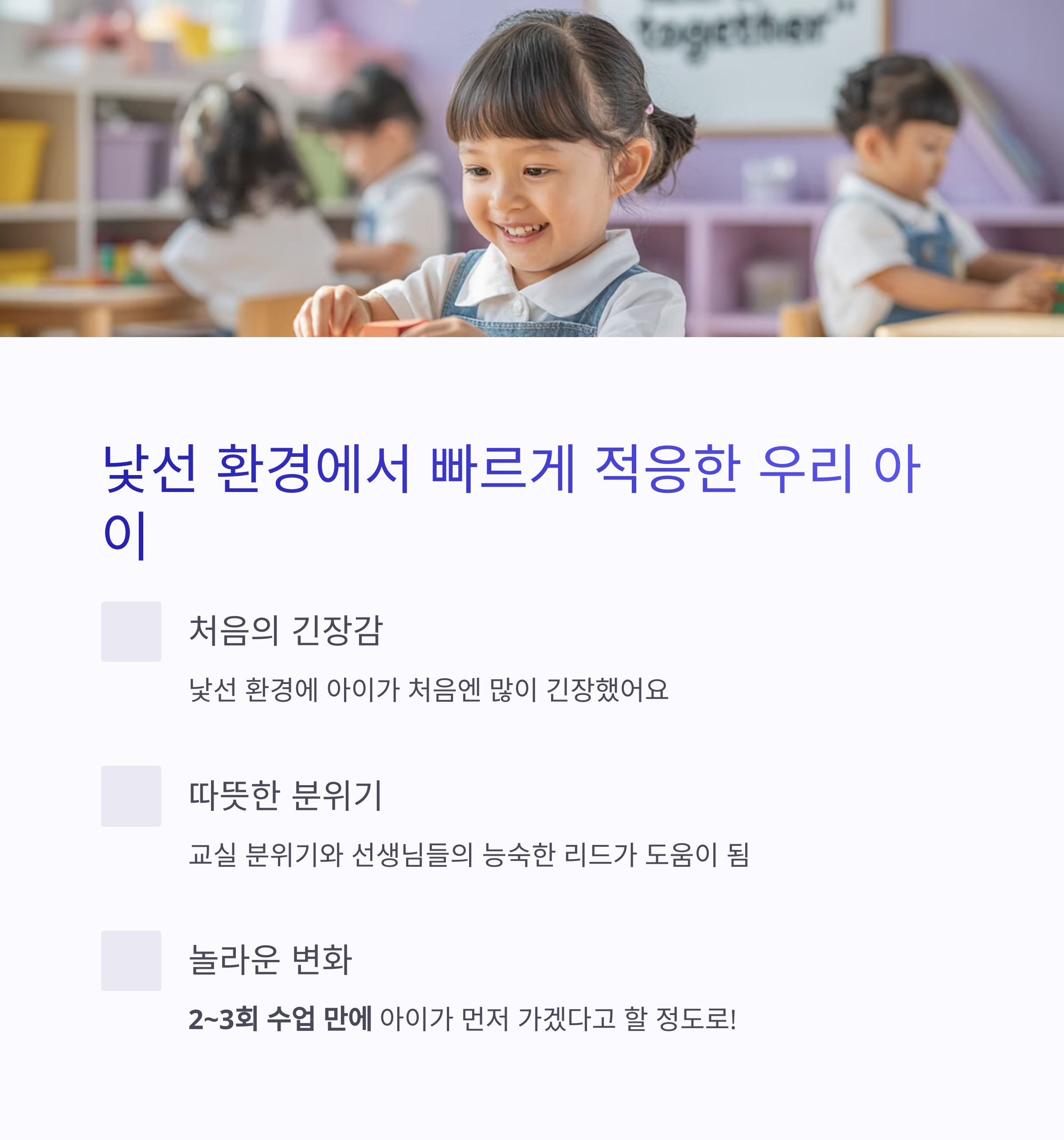2~3회 수업 만에 아이가 먼저 가겠다고 할 정도로 달라졌습니다.
