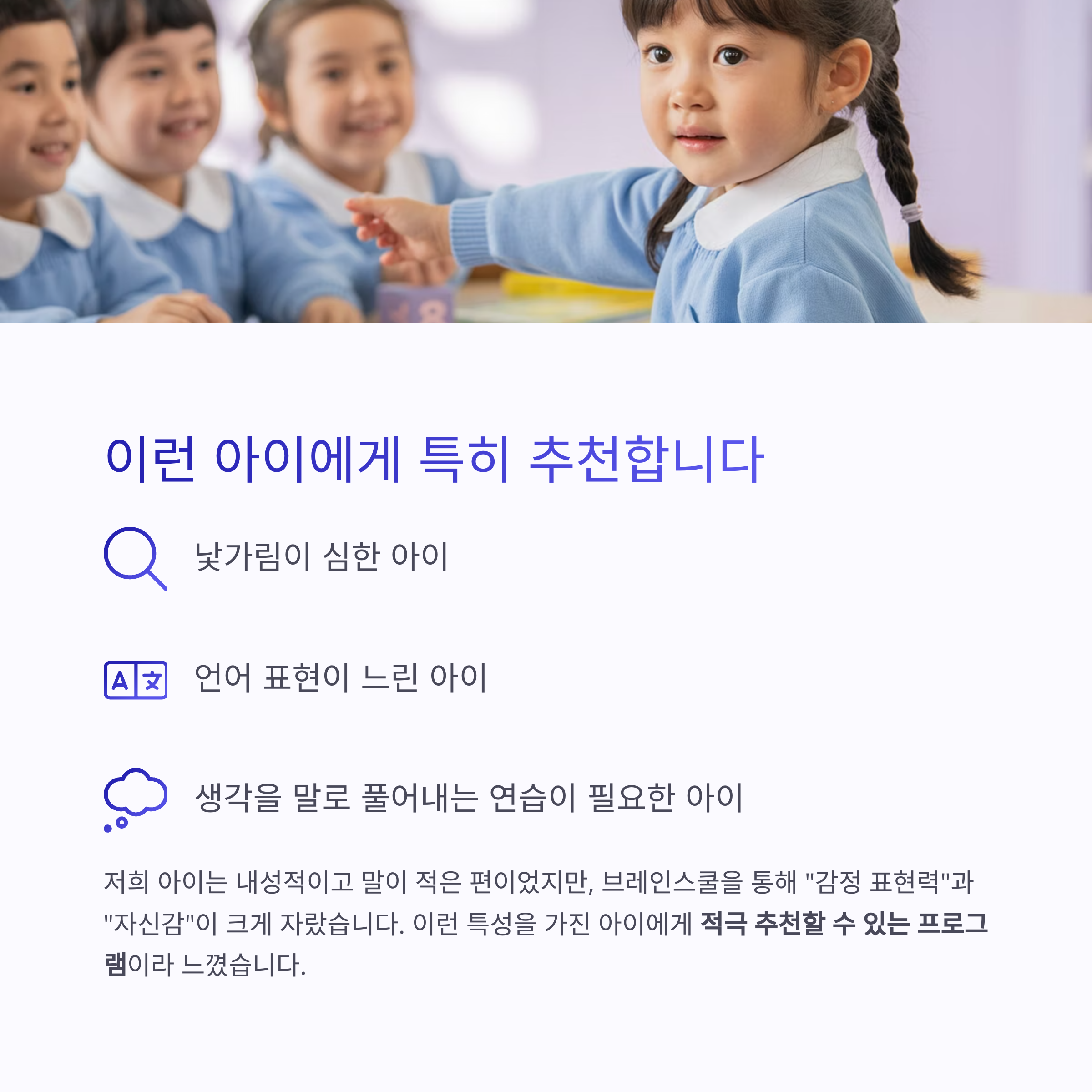 브레인스쿨을 통해 "감정 표현력"과 "자신감"이 크게 자랐습니다.