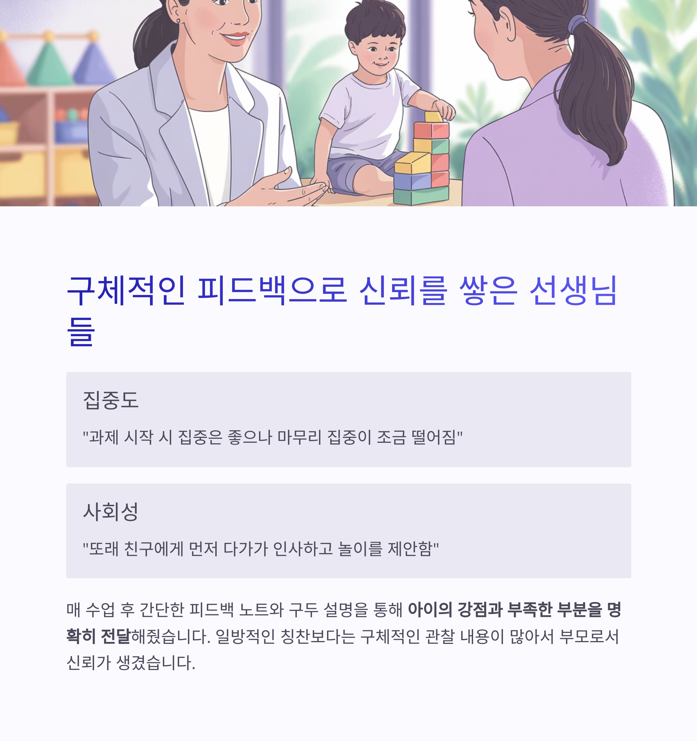 "이런 피드백은 집에서의 양육 방향에도 큰 도움"이 되었습니다.