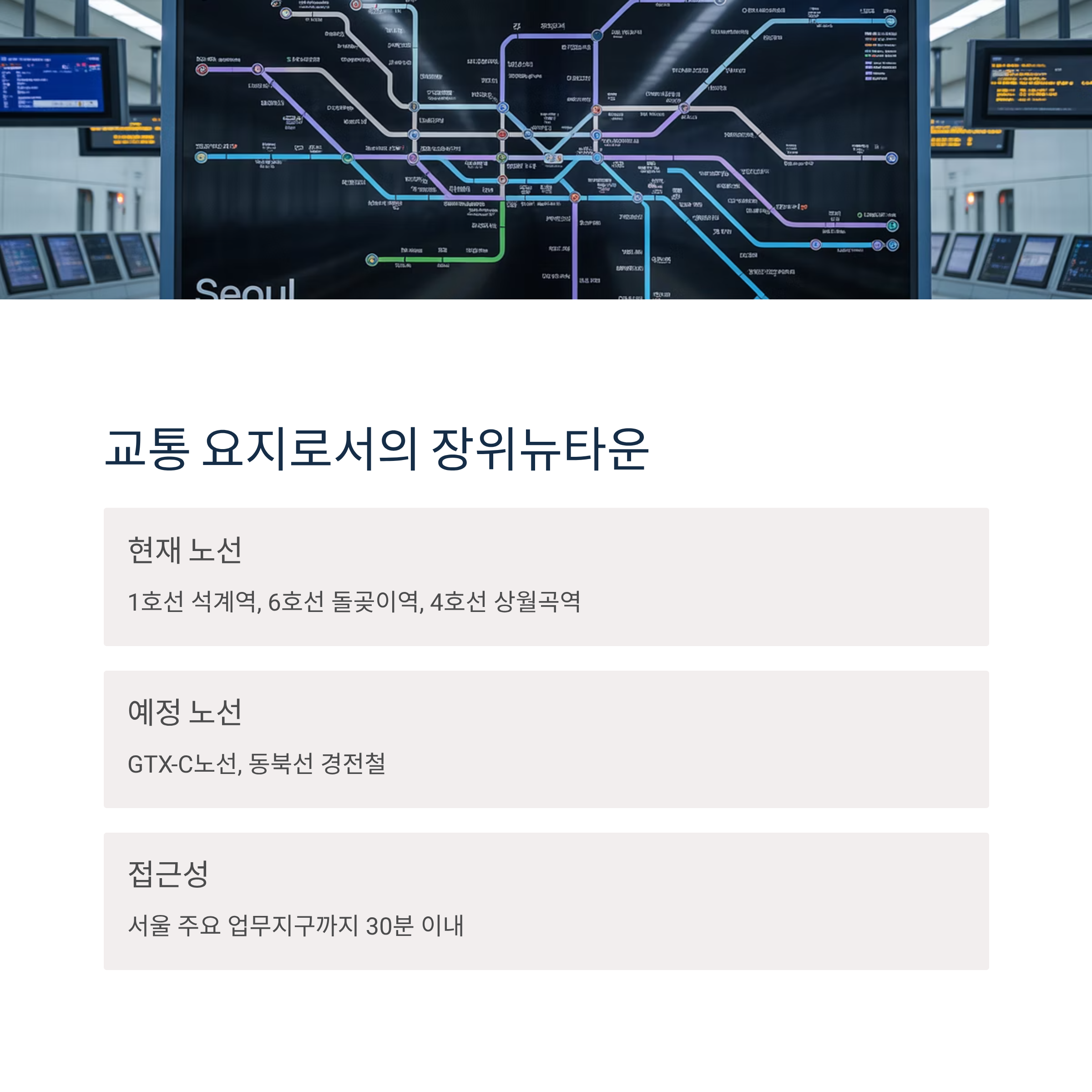 장위뉴타운은 1호선 석계역, 6호선 돌곶이역, 4호선 상월곡역 등 여러 노선을 품고 있는 교통 요지입니다.