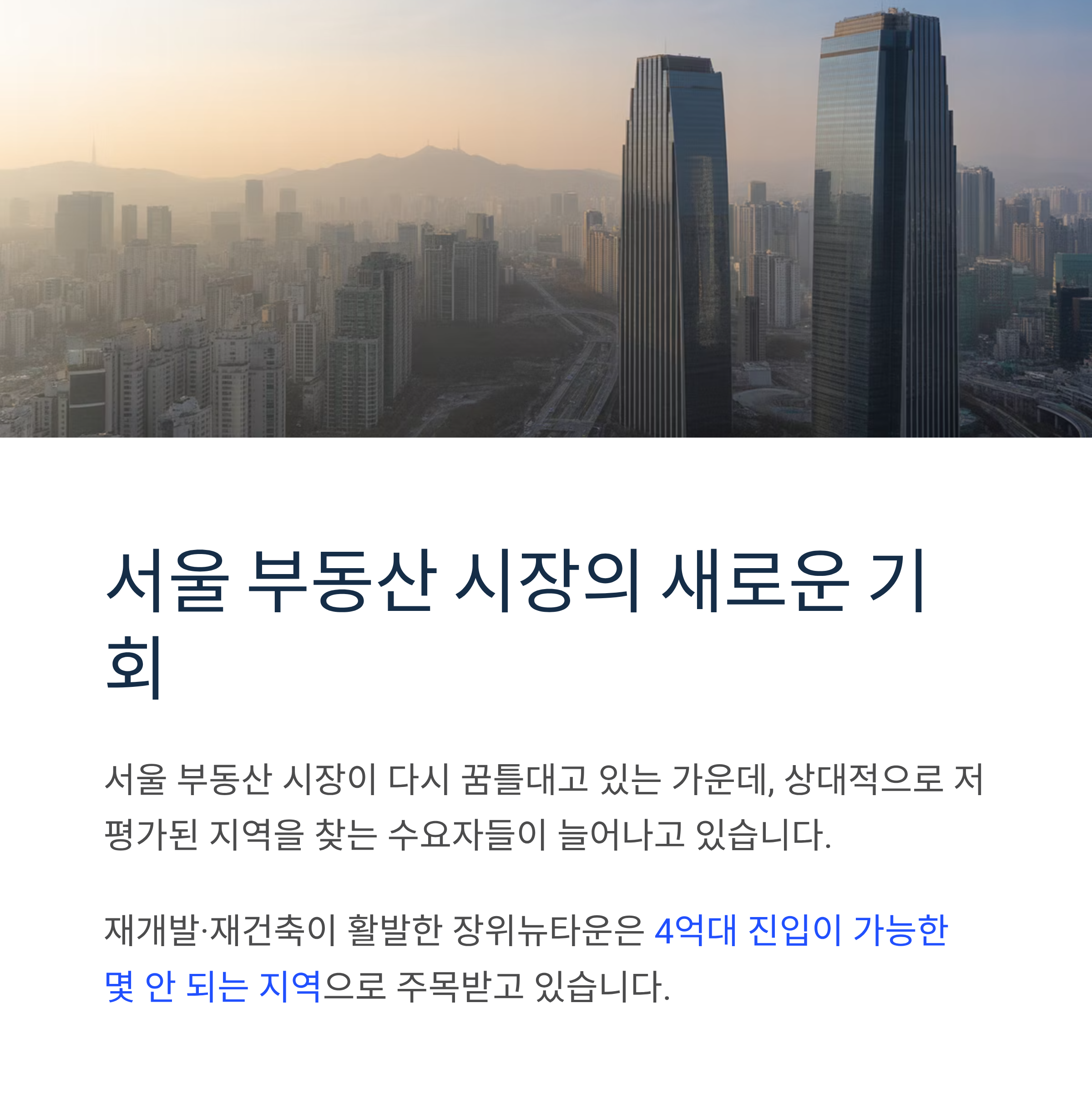 서울 부동산 시장이 다시 꿈틀대고 있는 가운데, 상대적으로 저평가된 지역을 찾는 수요자들이 늘어나고 있습니다. 특히 재개발·재건축이 활발하게 이뤄지고 있는 장위뉴타운은 4억대 진입이 가능한 몇 안 되는 지역으로 꼽히며 관심이 집중되고 있습니다. 본 글에서는 4억이라는 현실적인 예산으로 왜 장위뉴타운이 주목받고 있는지, 그리고 지금이 매수 타이밍인 이유에 대해 구체적으로 짚어보겠습니다.