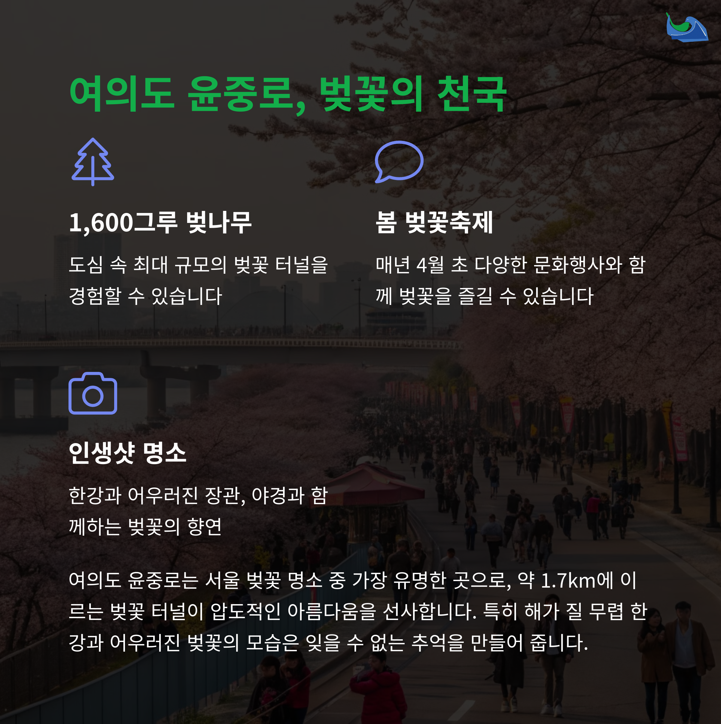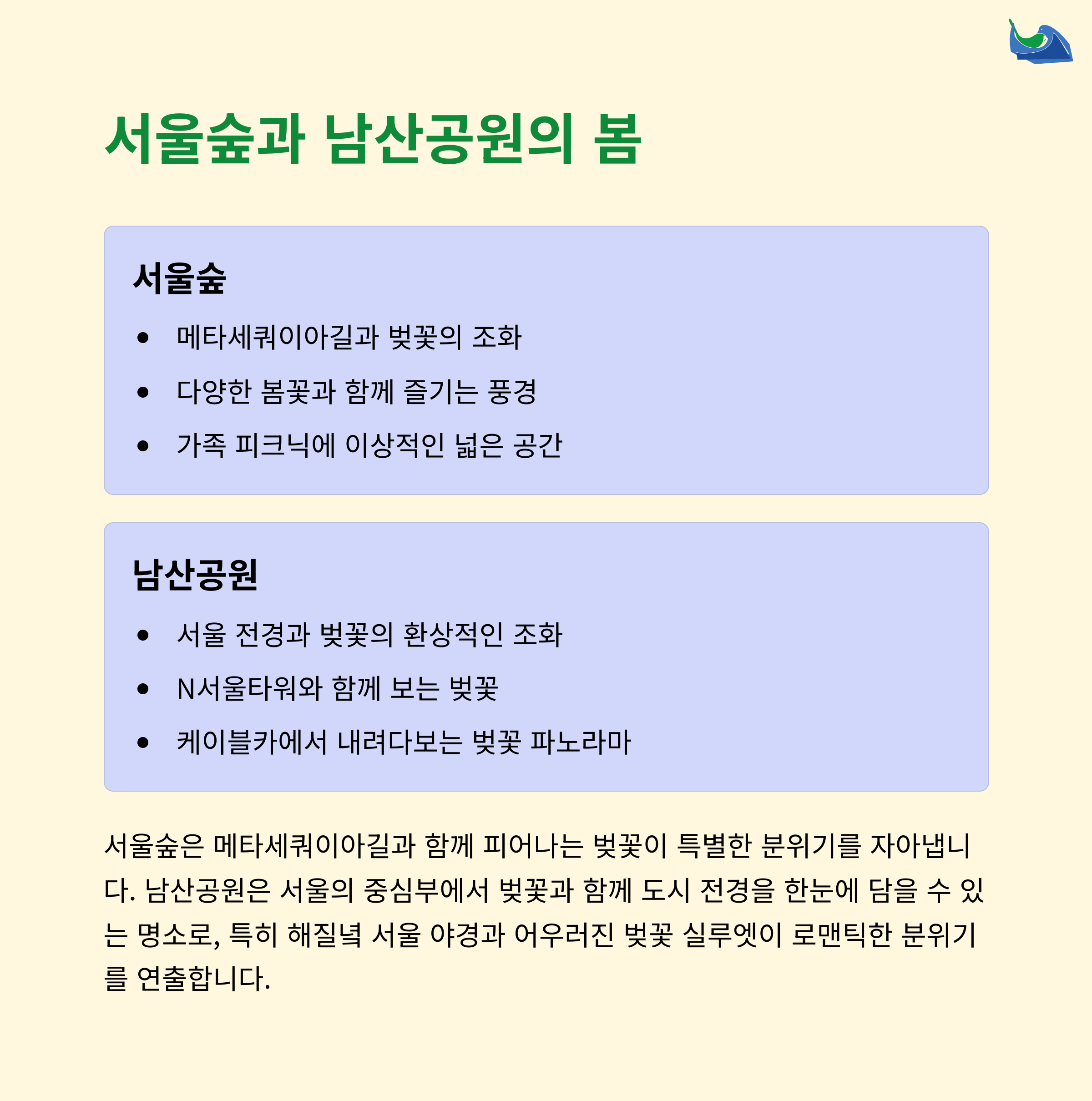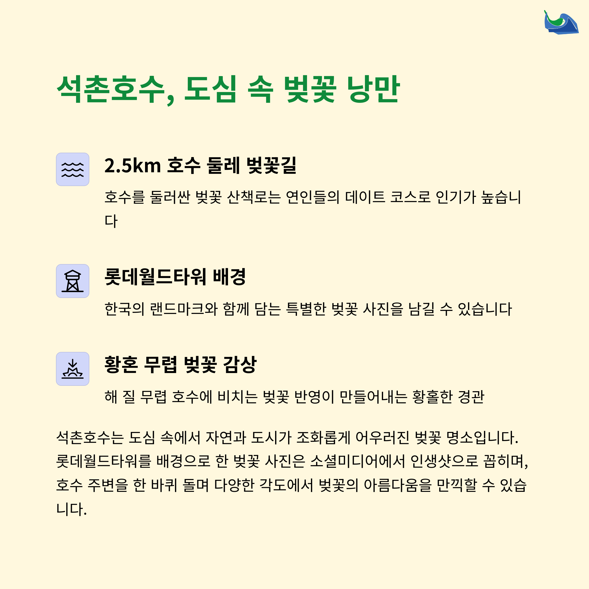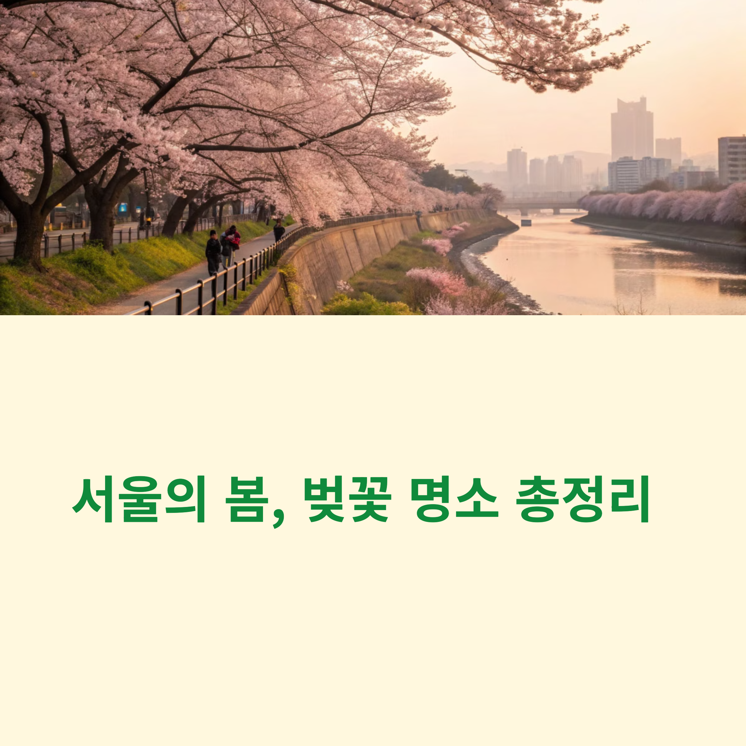 | 4월 1일 개화, 4월 8일 만개 예상 | 여의도, 석촌호수, 서울숲, 남산, 정독도서관 | 산책, 사진 촬영, 피크닉, 야경 감상 |