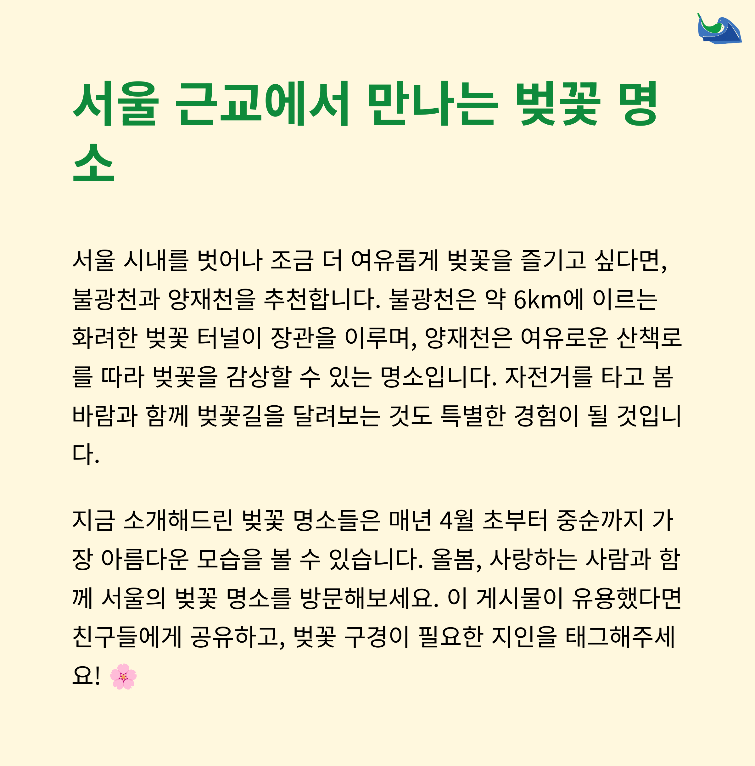 | 날씨와 예보 참고 후 방문 계획 | 서울 근교: 불광천, 양재천 | 조용한 산책과 한적한 감상 |