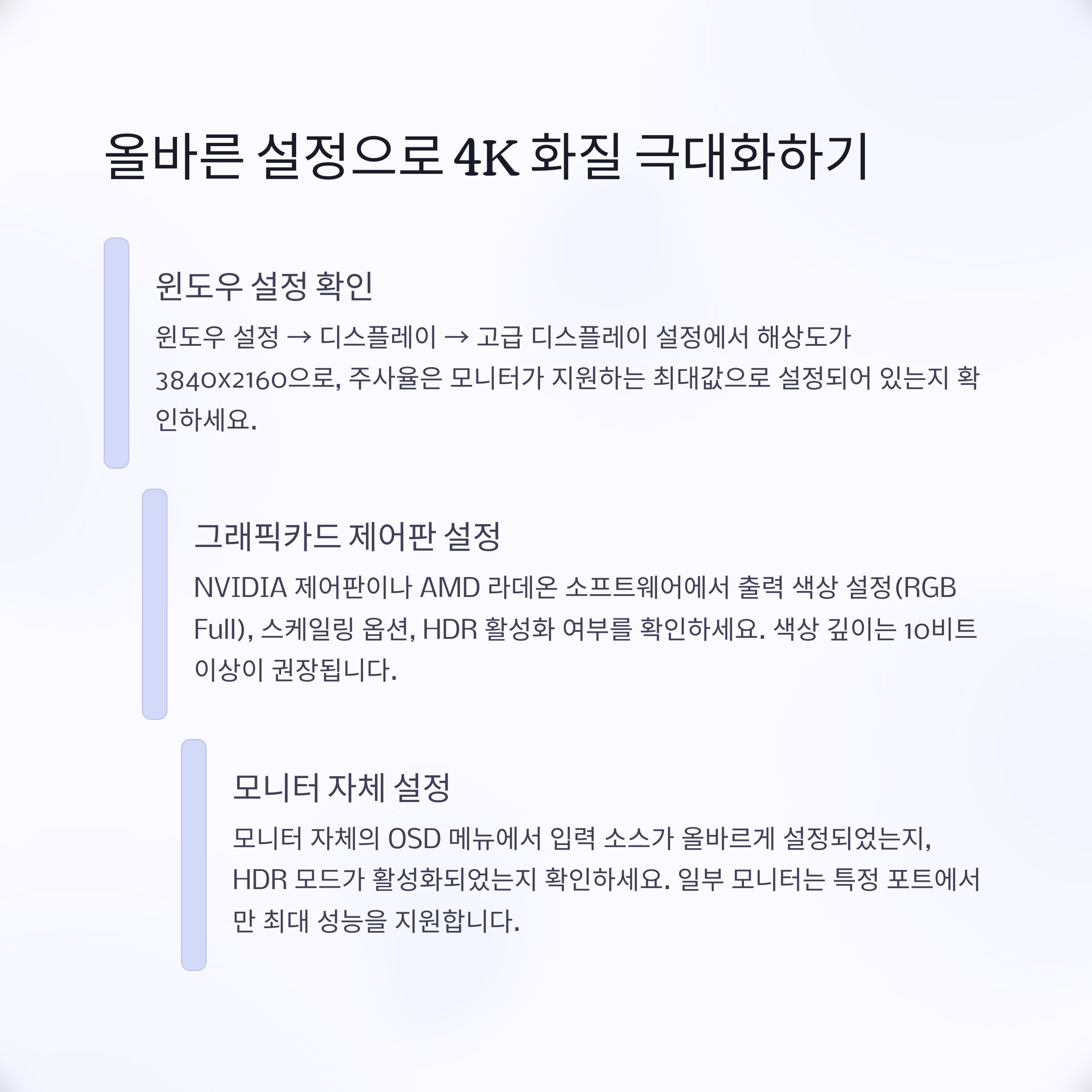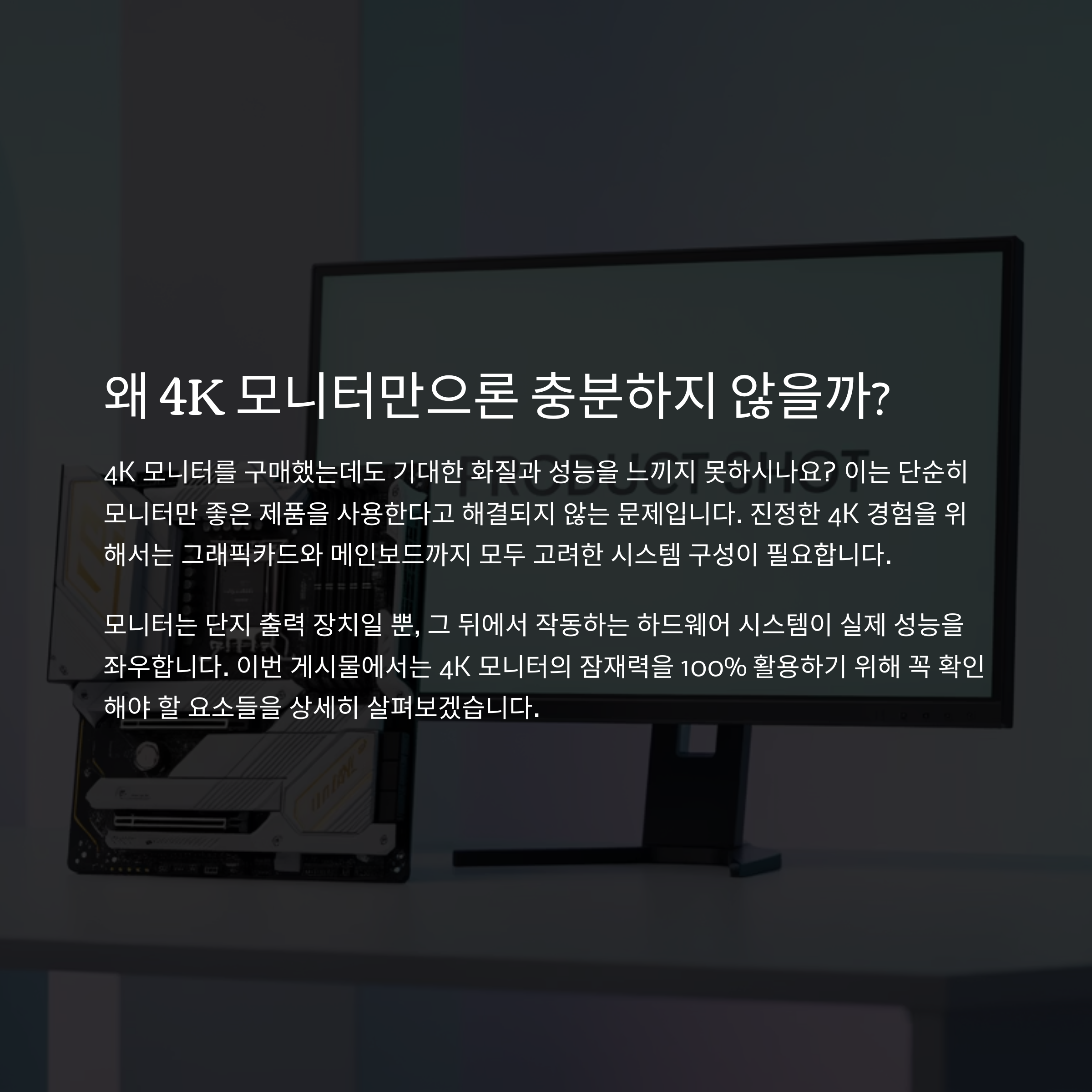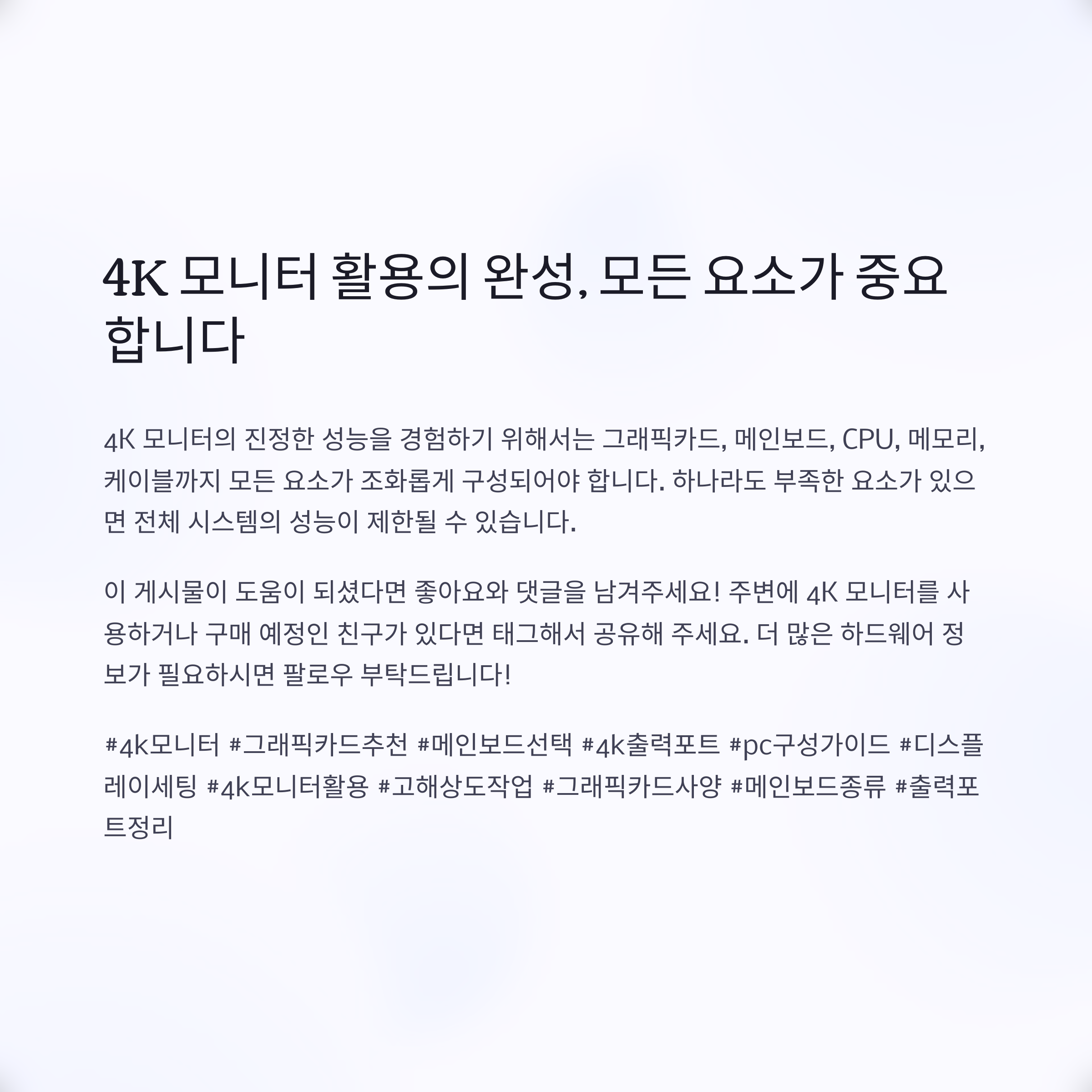 4K 모니터를 구매한 뒤에도 화질이 기대만 못하거나 성능 저하를 느끼는 분들이 많습니다. 이는 단순히 모니터만 좋은 제품을 쓴다고 해결되지 않는 문제로, 그래픽카드와 메인보드 구성까지 모두 고려해야 제대로 된 4K 환경을 누릴 수 있습니다. 본 글에서는 4K 모니터를 온전히 활용하기 위해 꼭 확인해야 할 시스템 구성 요소와 주의사항을 자세히 다뤄보겠습니다.