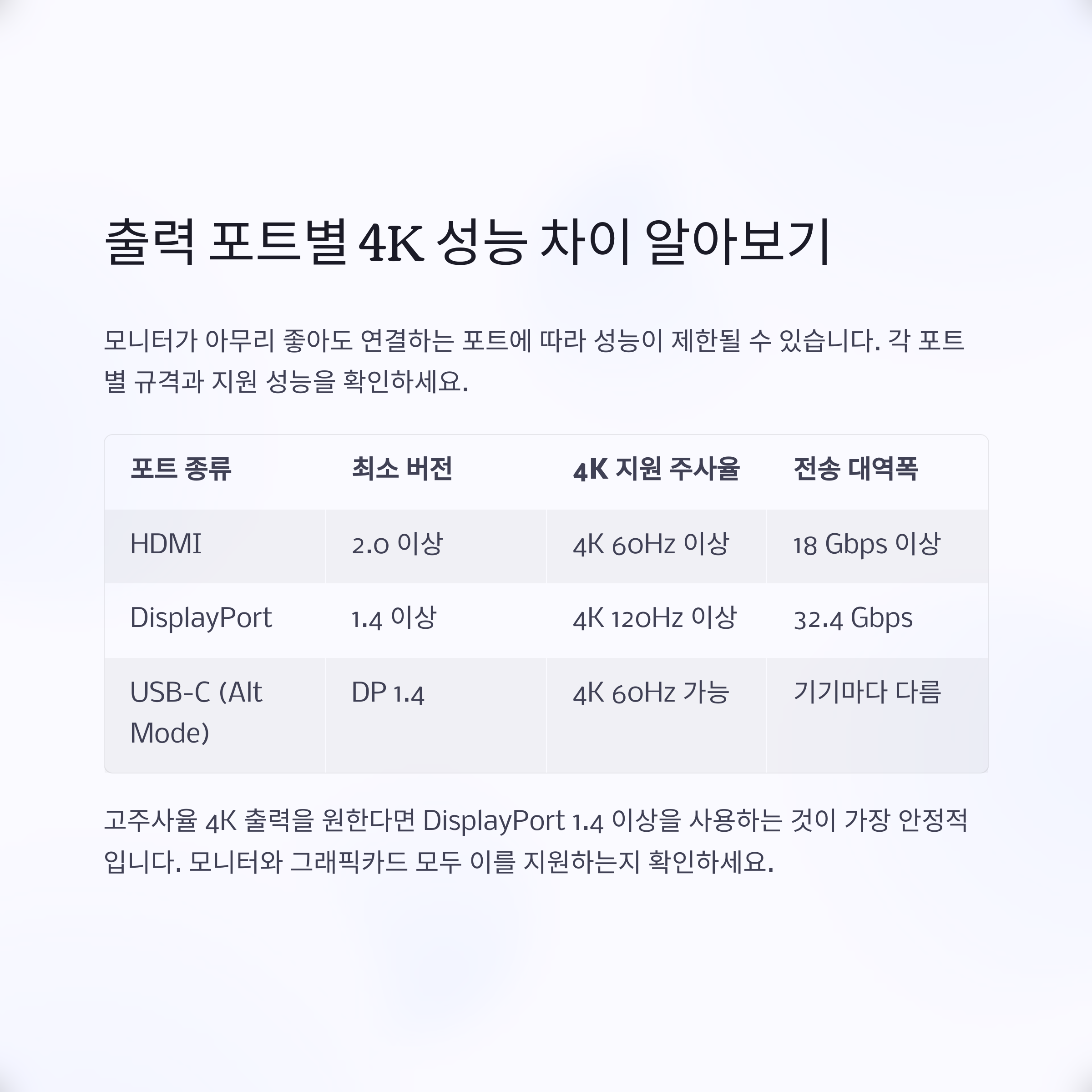 | DisplayPort | 1.4 이상 | 4K 120Hz 이상 | 32.4 Gbps |